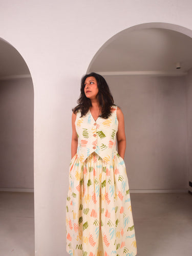 Feminine yet fuss-free, with just the right amount of charm. Cut in our exclusive cream and colourful scribble hand-screen printed cotton. The vest features buttons at the front and a clean silhouette. This playful pleated skirt is complete with pockets and adds levity to any occasion. Pair with chic boots or fun sneakers, you can't go wrong with this look.