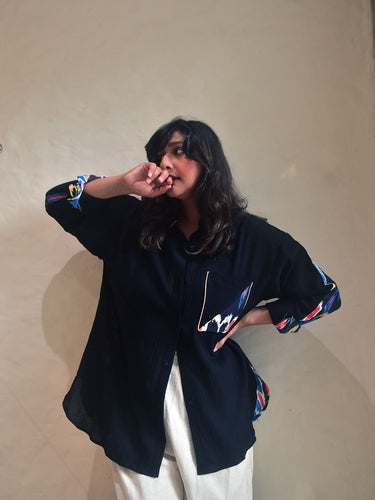 A statement in black, with a bold print in the back. Cut in our exclusive black cotton and multi-colored ikat printed cotton an oversized half and half shirt with matching buttons down the center.