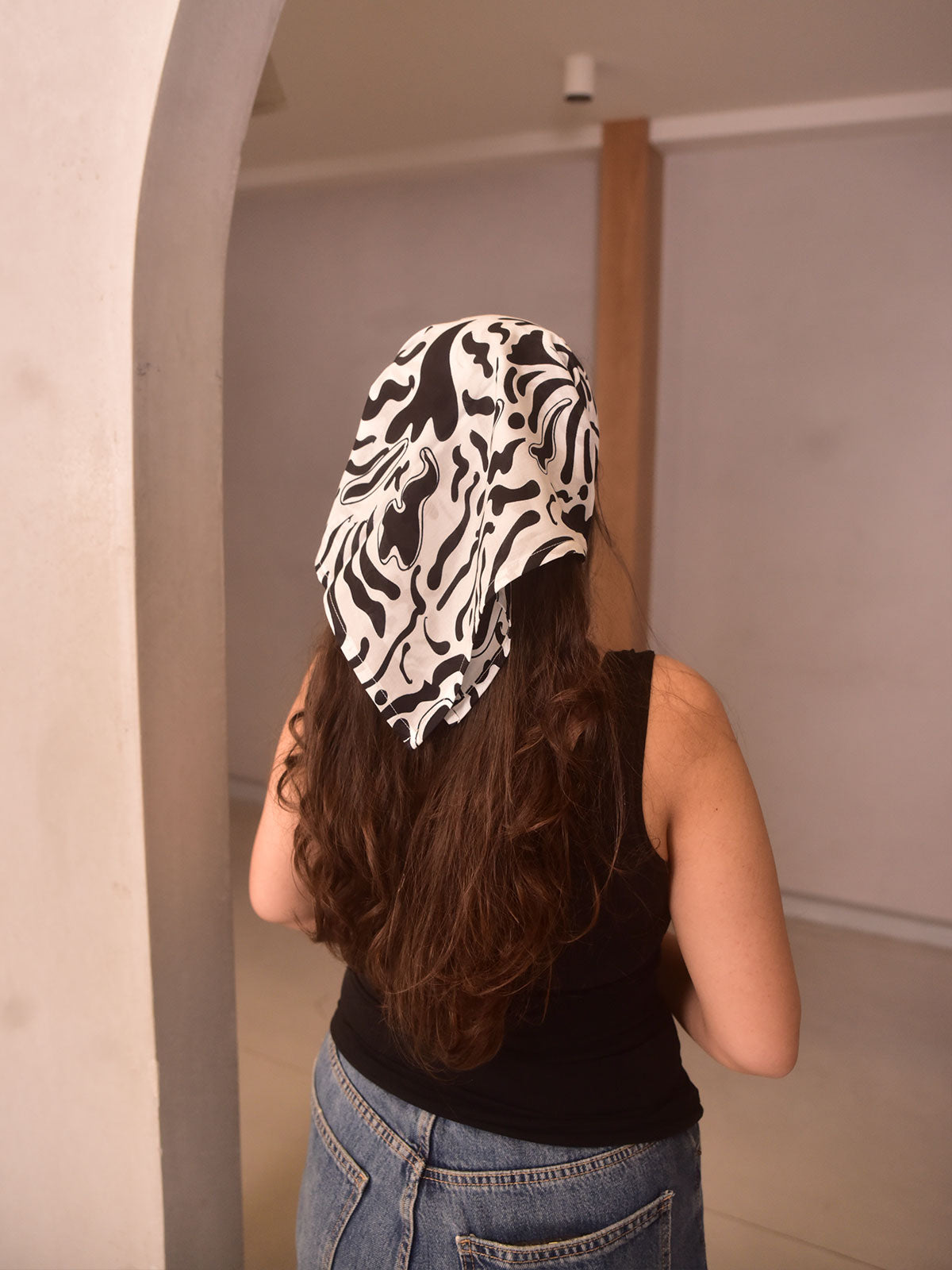 Crafted in black-and-white hand-screen printed modal cotton, this scarf feels soft with a striking graphic look. Wear it as a sleek neck tie or fold it into a headband. Ideal for creative workplaces, gallery visits, and evening socials.