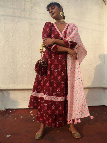 Elegance and grace of an anarkali kurta in timeless maroon cotton. Cut in maroon floral hand-block printed cotton. The kurta has a wrap-style bodice with contrast pink panelling on the neckline. Three-fourth puffed sleeves ending in similar pink-detailed cuffs. The three panelled skirt has pockets on both sides and a light, flowy fall. The maroon printed pants have elastic at the waist for comfort. The anarkali set is completed with a hand-block printed cotton dupatta in pastel pink and handmade tassels. Pair with our Ada Potli to carry everything you need. And you can add some glitter to the look with our Rose Gold Choker!