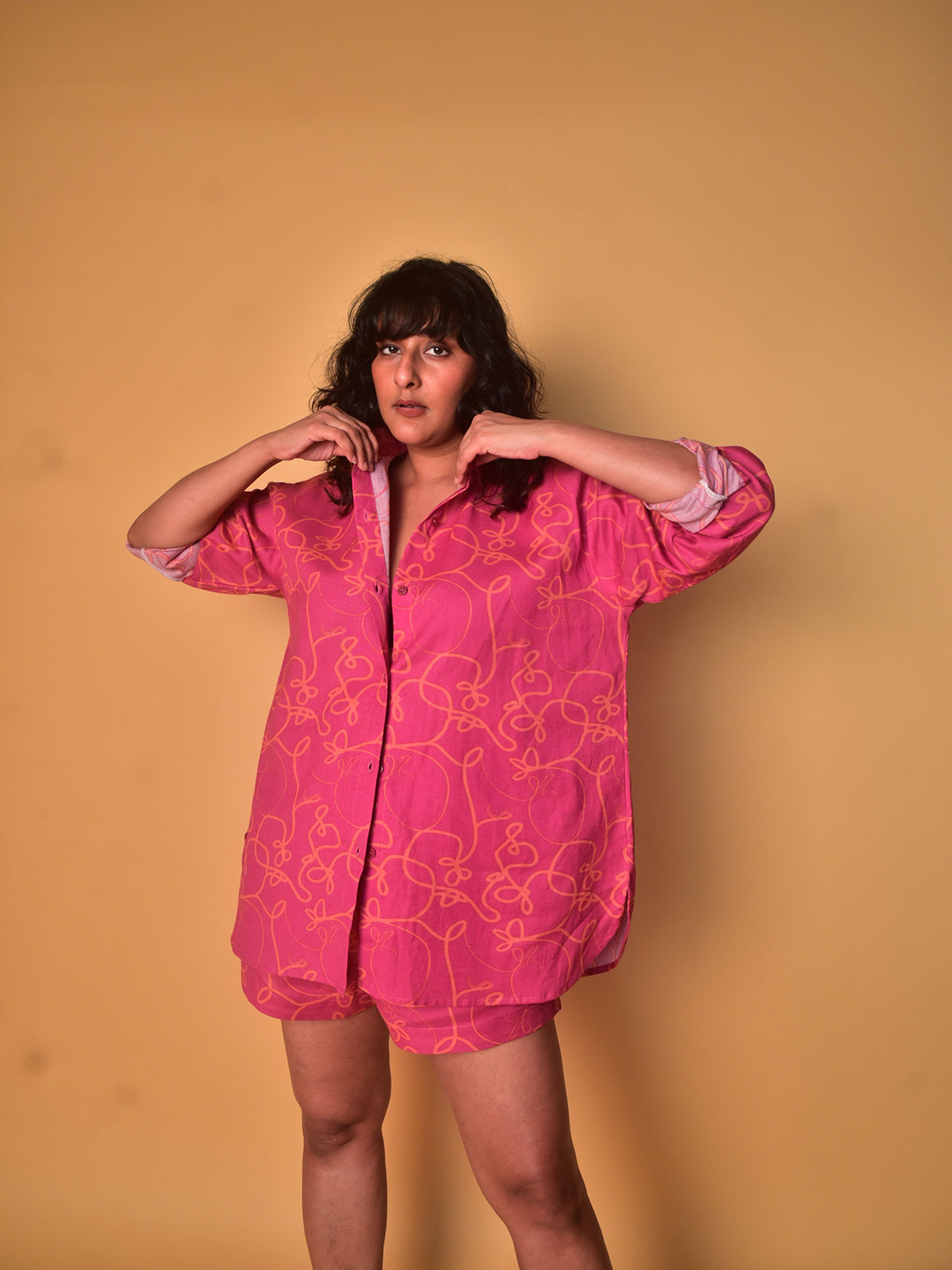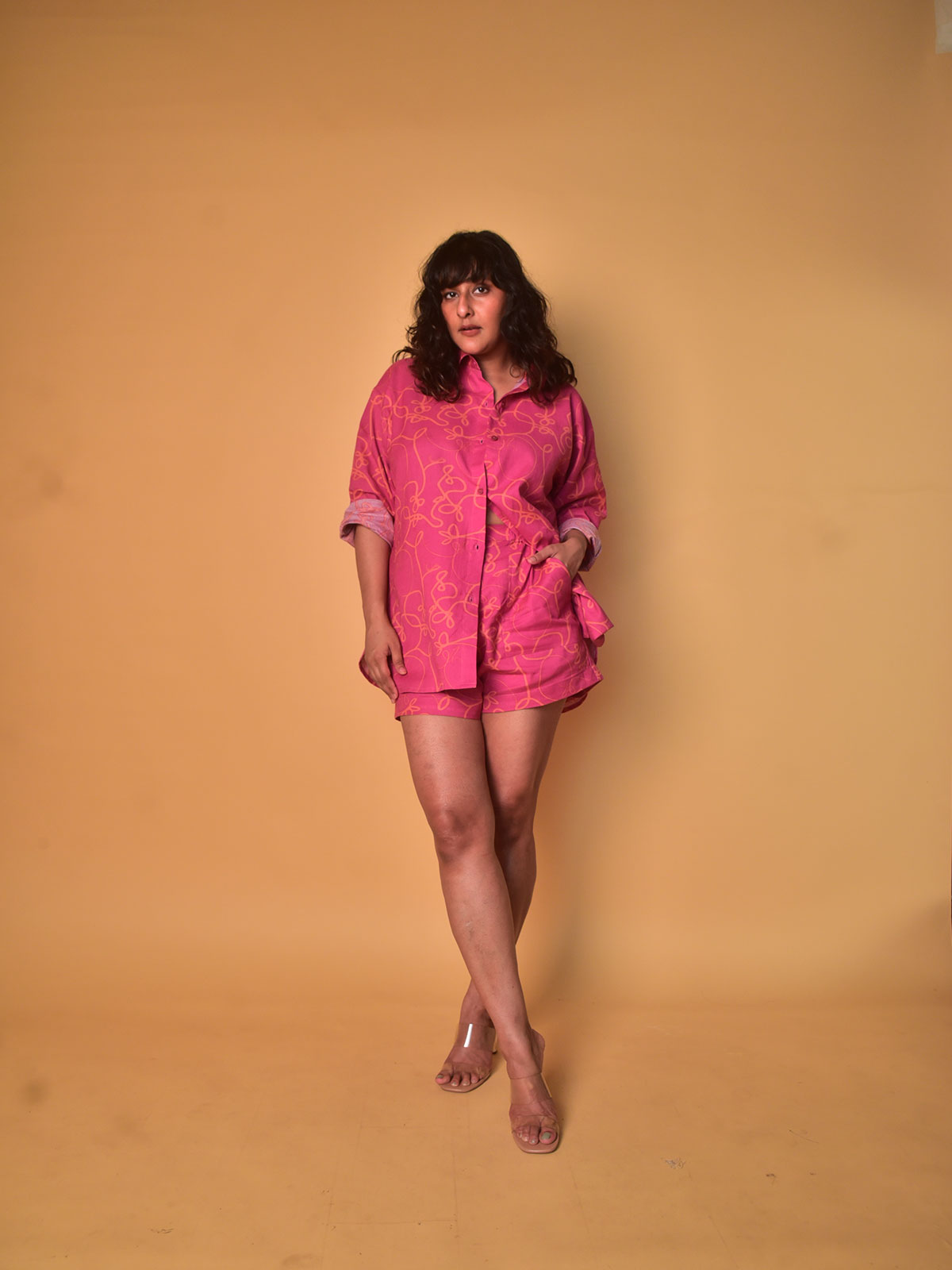 Find yourself in this Vibrant and elegant oversized co-ord set this season! Classic and refined, this shirt is a must-have in your wardrobe. This oversized shirt cut in pink printed cotton fabric is designed to make a statement, it has a shirt collar and buttons down the centre for a classic shirt look. Paired with Amy Shorts for a clean and sophisticated look.