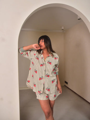 Cut in our exclusive green stripes printed cotton and green dyed cotton linen, this relaxed shirt is designed for ease and versatility. Featuring an apple-cut hem and a distinctive criss-cross back opening, it brings a playful yet elevated touch to everyday wear. Ideal for casual outings, holidays, or warm-weather layering. Pair it with the matching shorts for a coordinated look or wear it over separates.