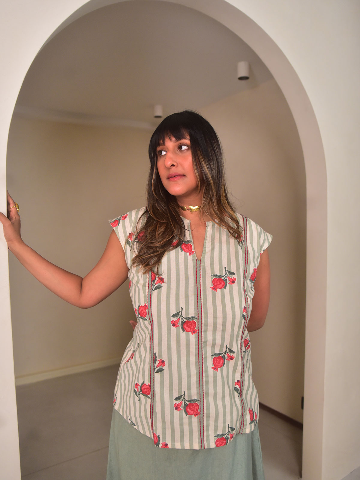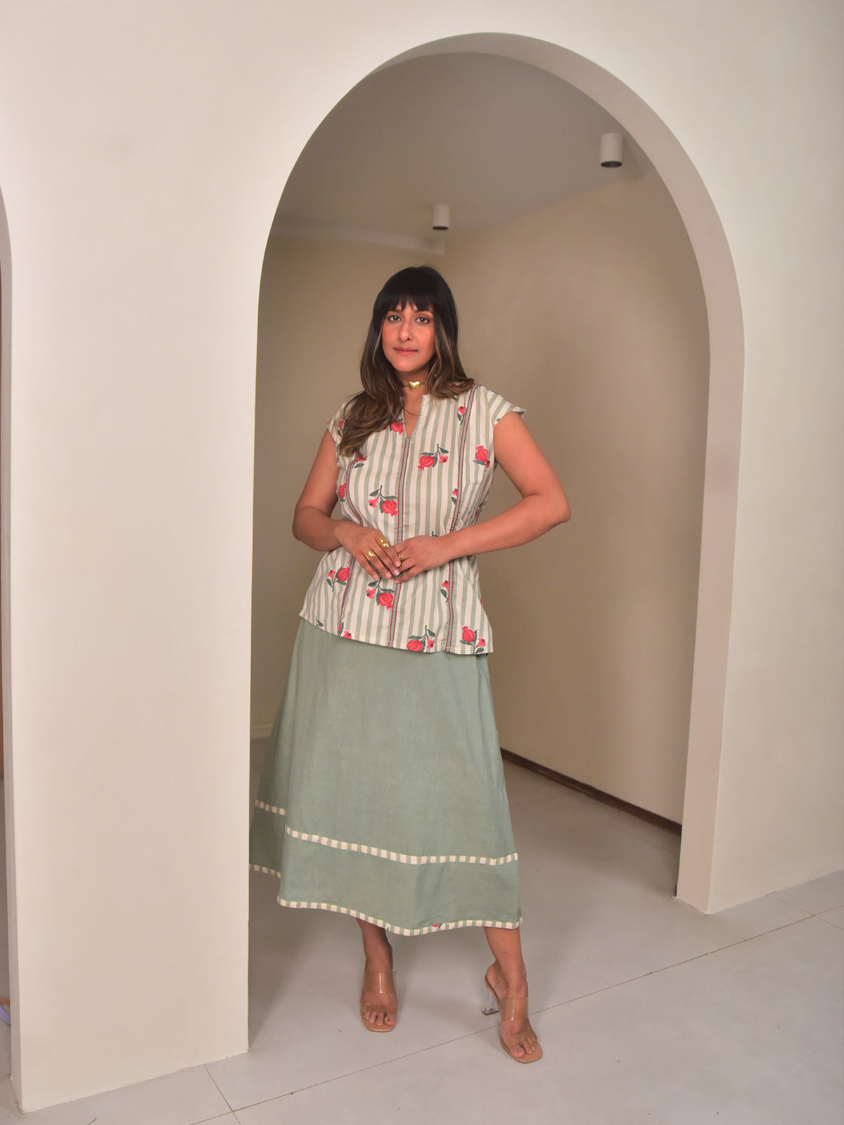 This elevated set features a sleeveless top in green stripes printed cotton with back tie-ups and three-panel detailing accentuated by red thread stitches. It is paired with an A-line skirt cut in green dyed cotton linen, finished with horizontal panels of striped cotton at the hem, side pockets, and an elasticated waist for comfort. Ideal for summer gatherings, daytime festivities, or travel. Style with minimal accessories and sandals for a refined yet relaxed ensemble.