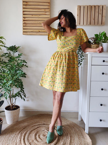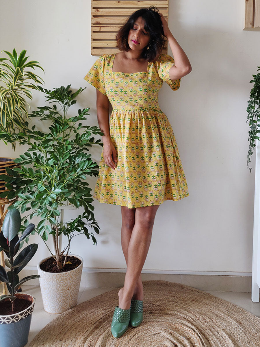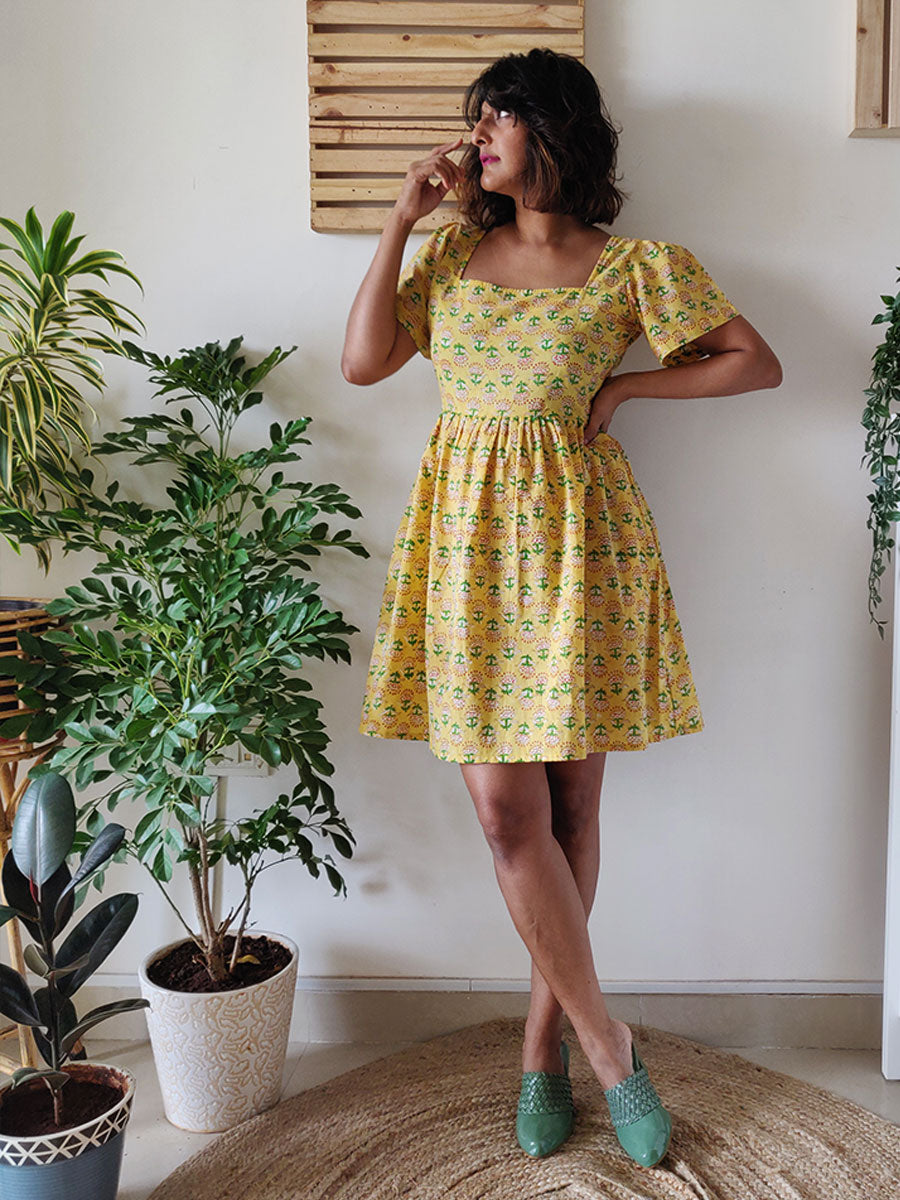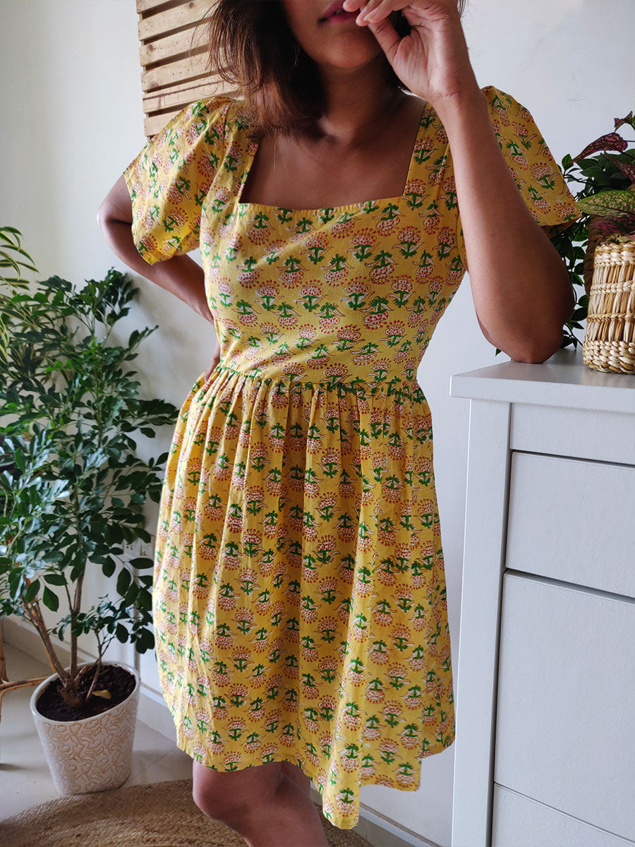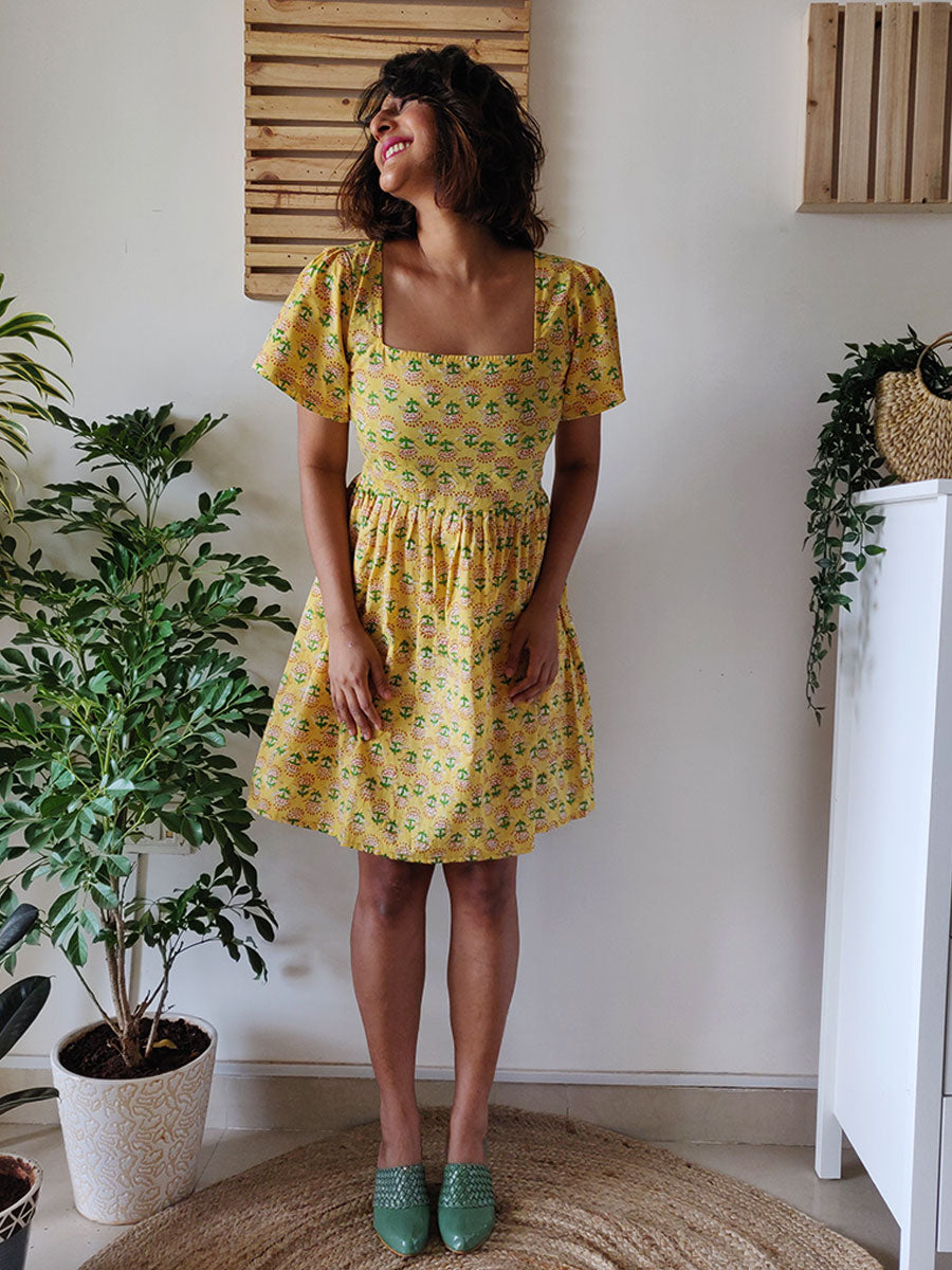 This cute flirty dress is cut in hand–block printed cotton with floral prints on yellow, with a very clean–cut square neckline and short sleeves and a pleated skirt! Pair with sneakers for a fun day out, and a sunhat if you want to embrace that summer vibe!