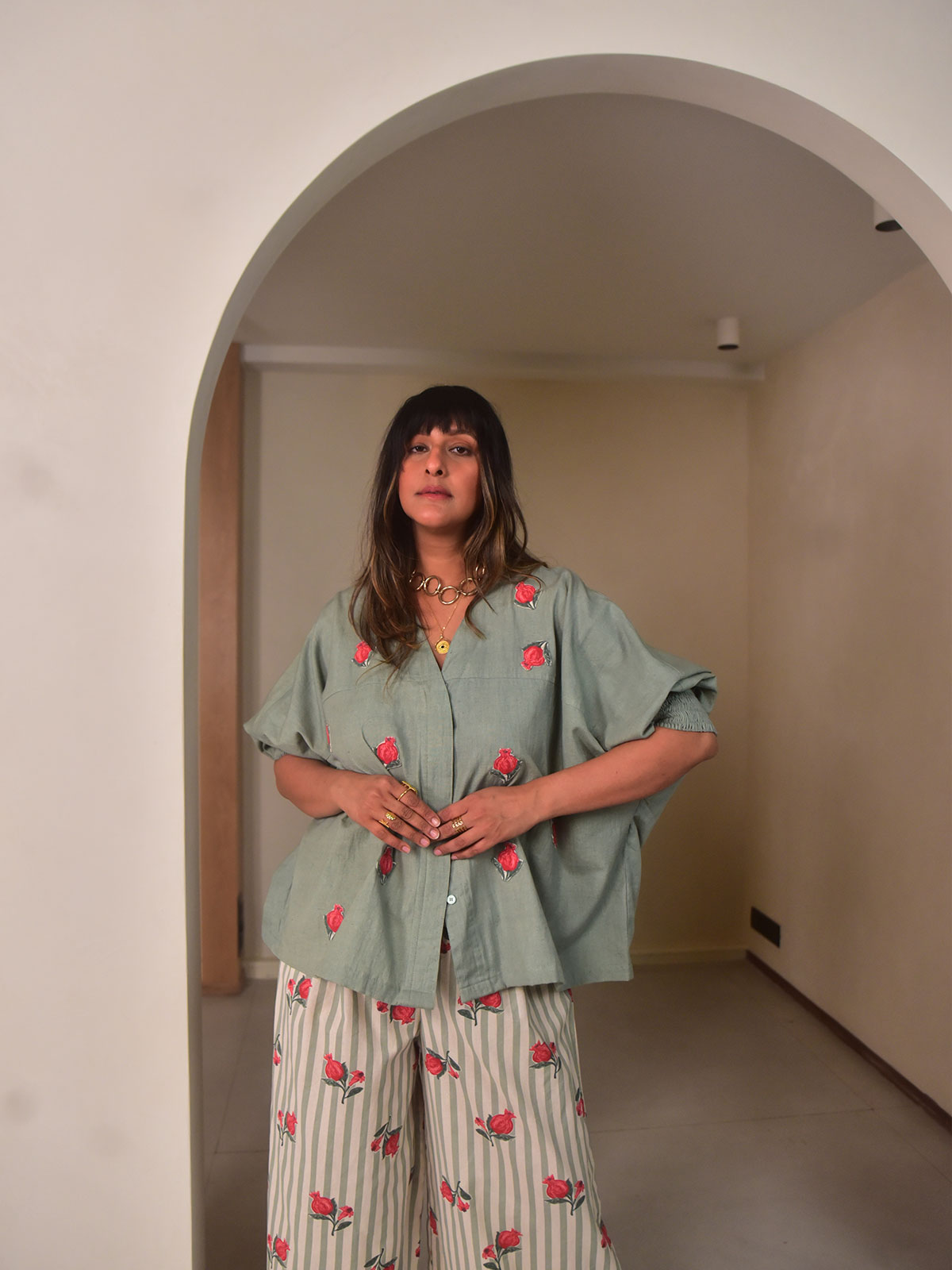 This oversized shirt is crafted in green dyed cotton linen and elevated with handcrafted pomegranate motif appliqués. Designed with a V-neckline, button-down front, and 3/4th length kimono sleeves finished with smocked cuffs, it offers a relaxed yet artisanal feel. Perfect for creative workdays, casual outings, or travel. Pair it with flared pants in green stripes printed cotton for a statement co-ord look.