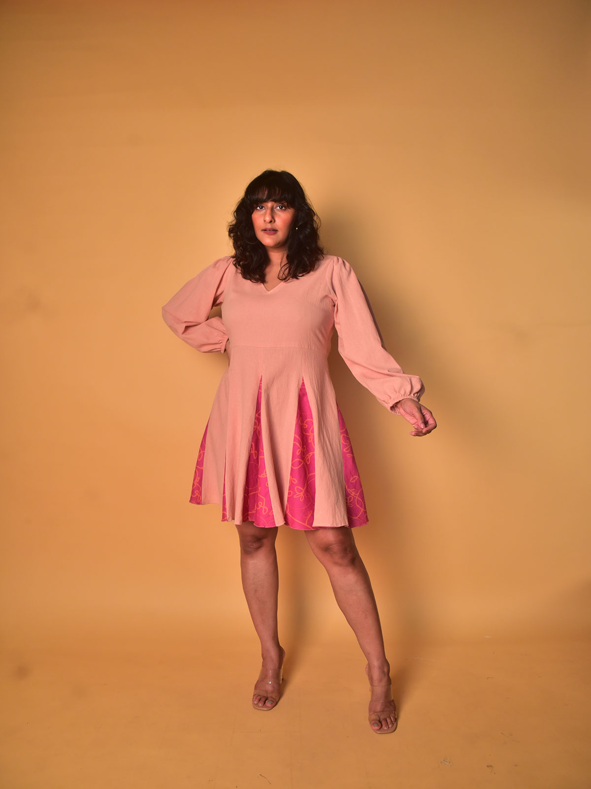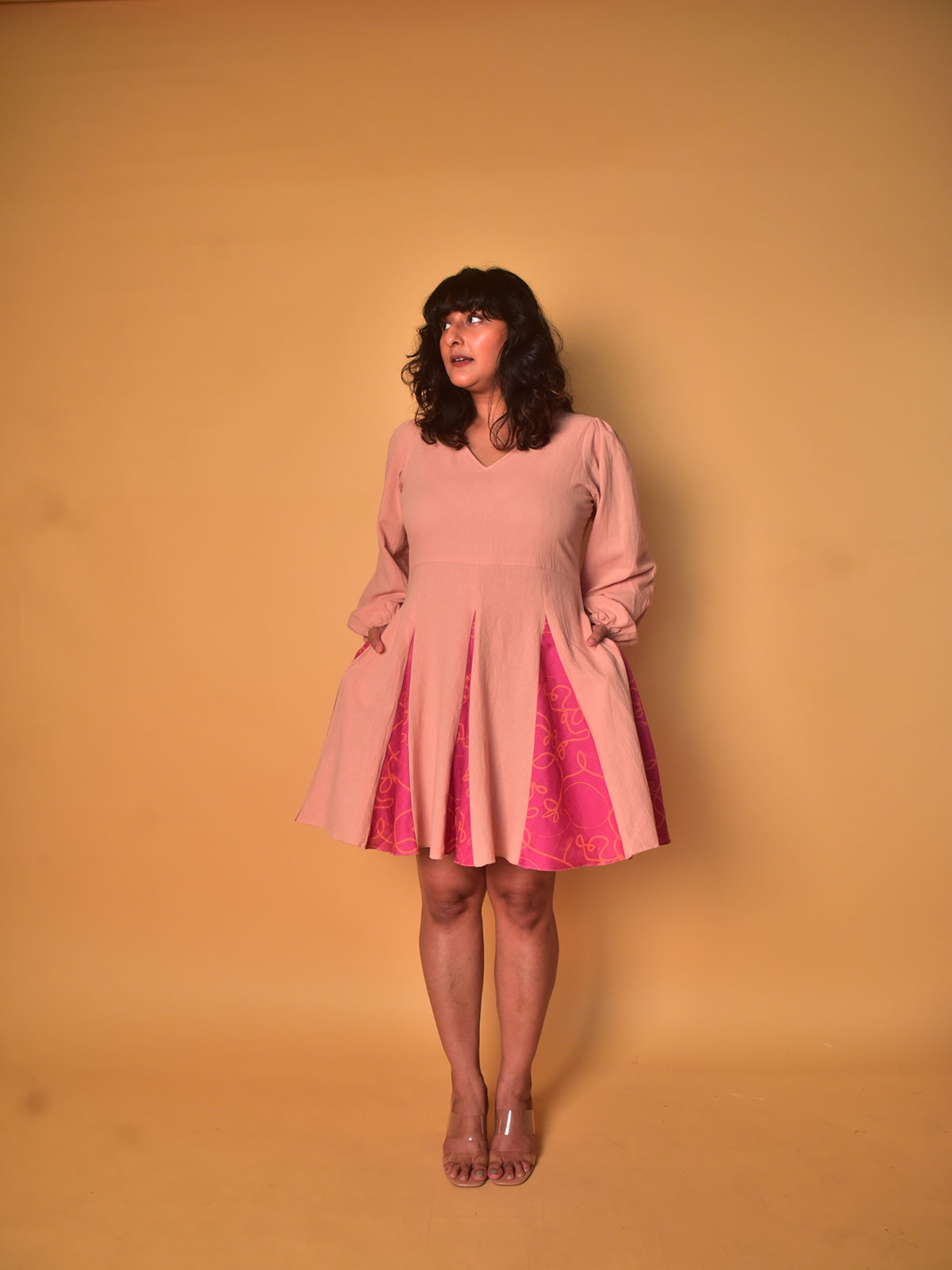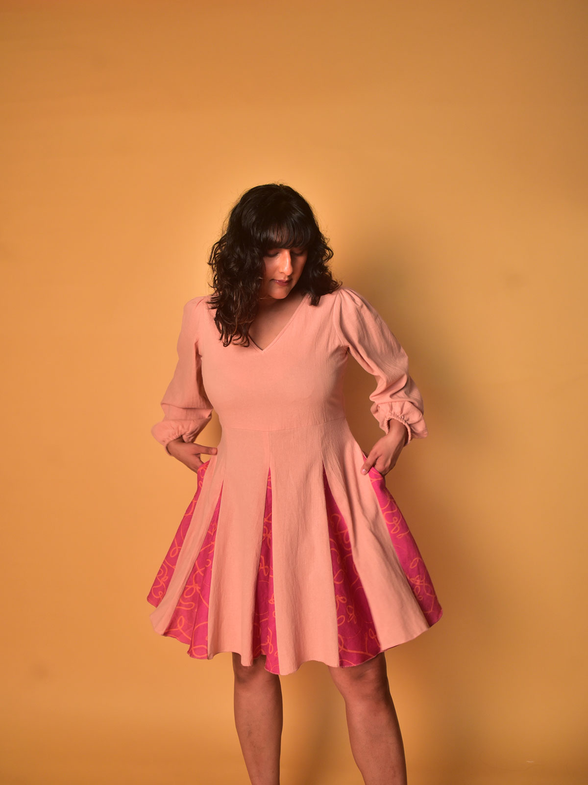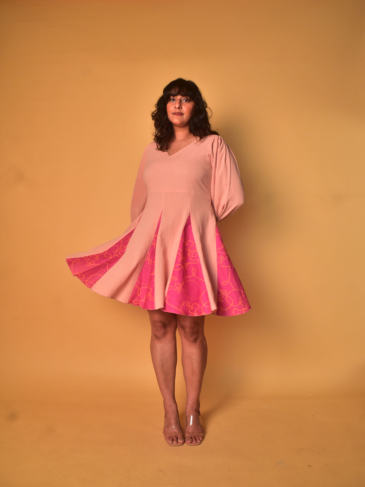 Easy breezy summer ready. Chic and elegant with some fun while you are at it! This dress is cut in peach crinkled cotton with the contrasting pink printed cotton fabric to give you that flirty look. Pair with sneakers and a cross-body bag or heels, this versatile dress can easily take you from day to night!