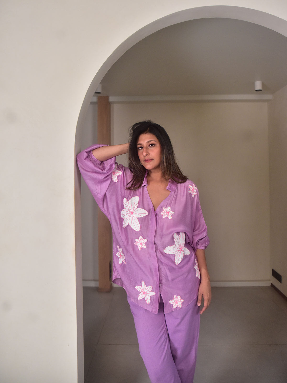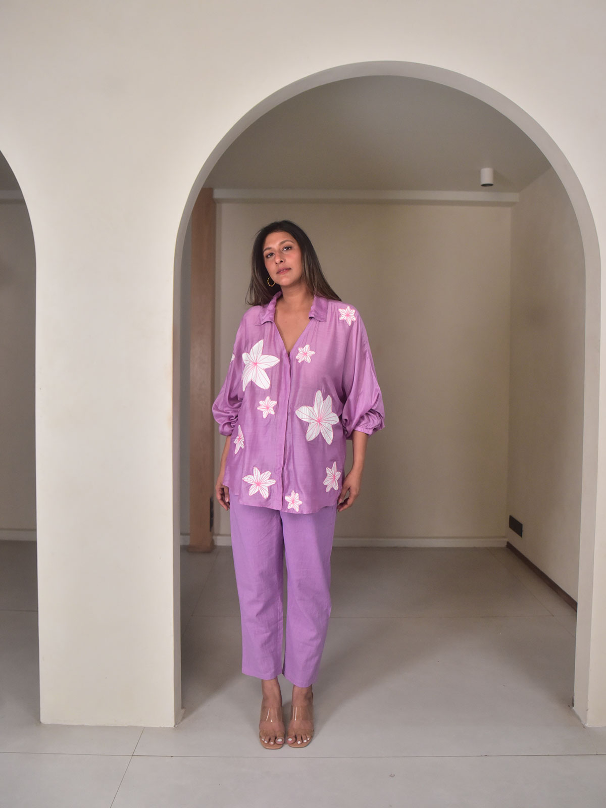 Breezy and effortlessly elegant, this lavender applique co-ord set is crafted for all-day comfort with a touch of sophistication. The oversized shirt, tailored in lightweight modal, features full sleeves with elasticated cuffs. Delicate flower appliqués add a handcrafted charm to the relaxed silhouette. Layered underneath is a breathable mul cotton slip for added comfort. The set is completed with narrow-fit cotton linen pants in a matching hue, designed with functional pockets and a clean finish. Style it with statement earrings and strappy flats for a brunch date, or elevate it with heels and a sleek bun for an evening gathering.