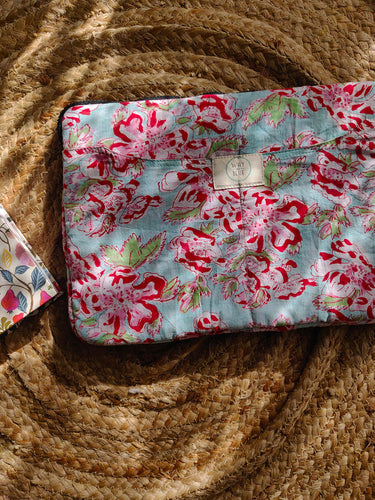 Add some fun to your workspace with this blue and pink hand-blocked printed floral sleeve! It has a padded pocket to hold your laptop and a separate space on the outside to hold the charger, secured in place with a zipper. Two additional pockets on the back can hold a little pocket diary, pens and knick-knacks. This laptop sleeve is made from leftover fabrics scraps from our production, reducing fabric waste that would otherwise end up in landfills.