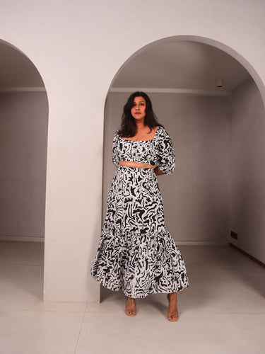 This chic off-shoulder top cut in our exclusive black and white hand-screen printed modal cotton with voluminous balloon sleeves that cinch at the wrists and is also padded for a comfortable fit. The design creates a balanced, feminine look, making it ideal for both day and night wear. The adjustable, off-shoulder cut adds a touch of allure which is perfect for your wardrobe. Pair with our Nia Skirt for a statement evening look.