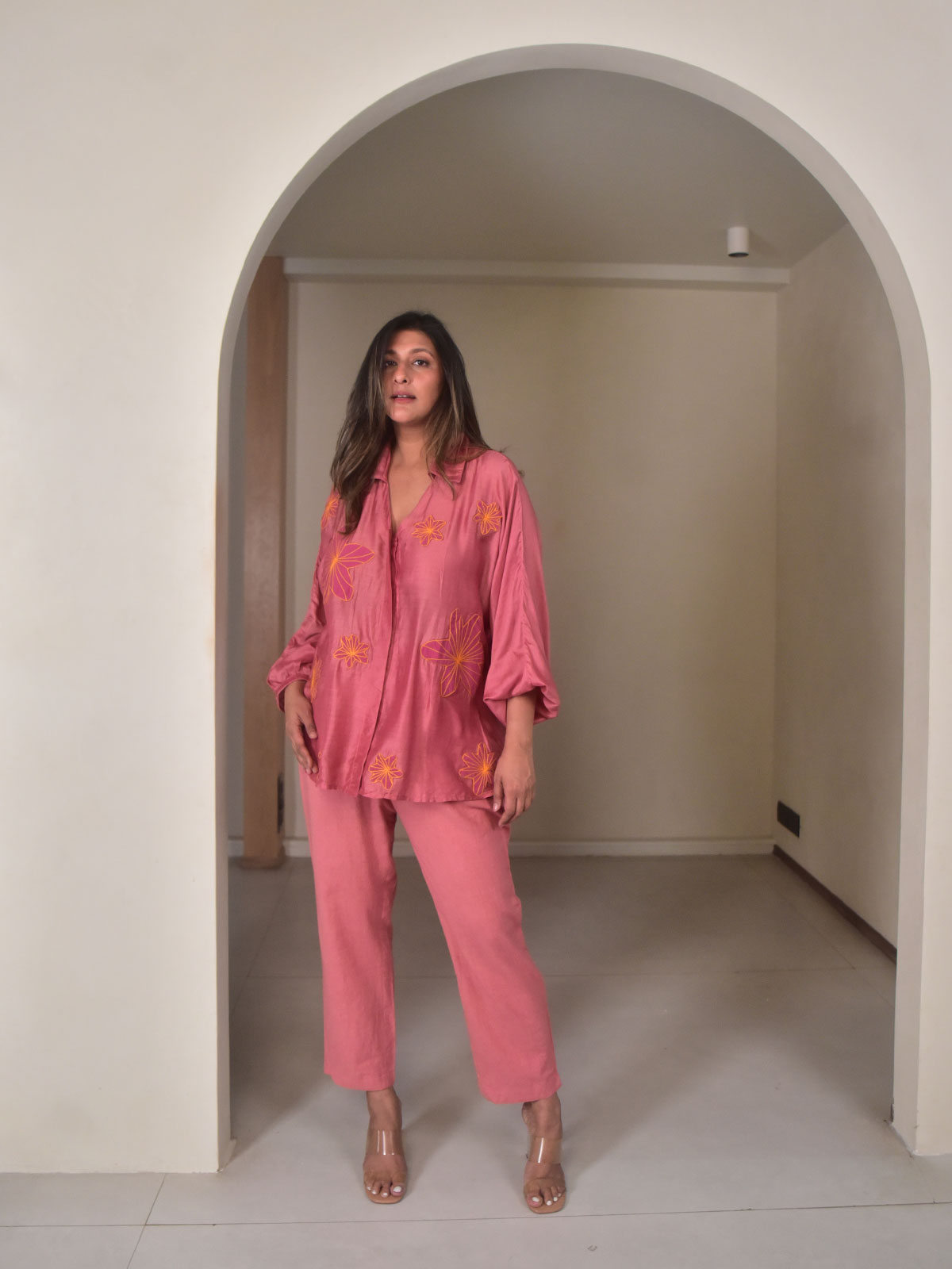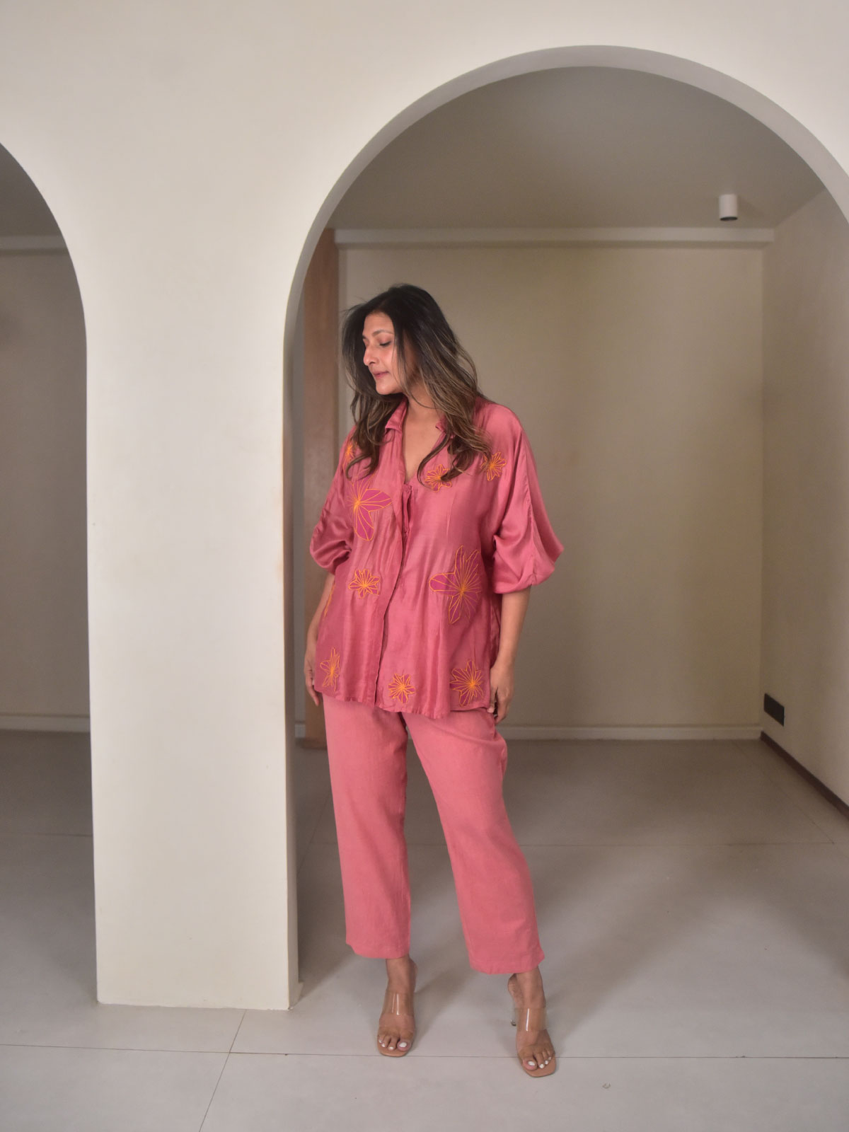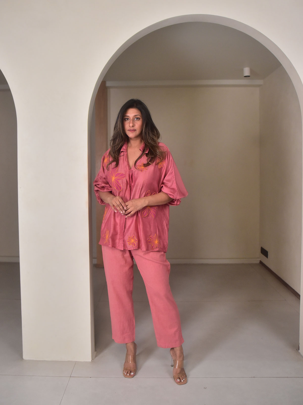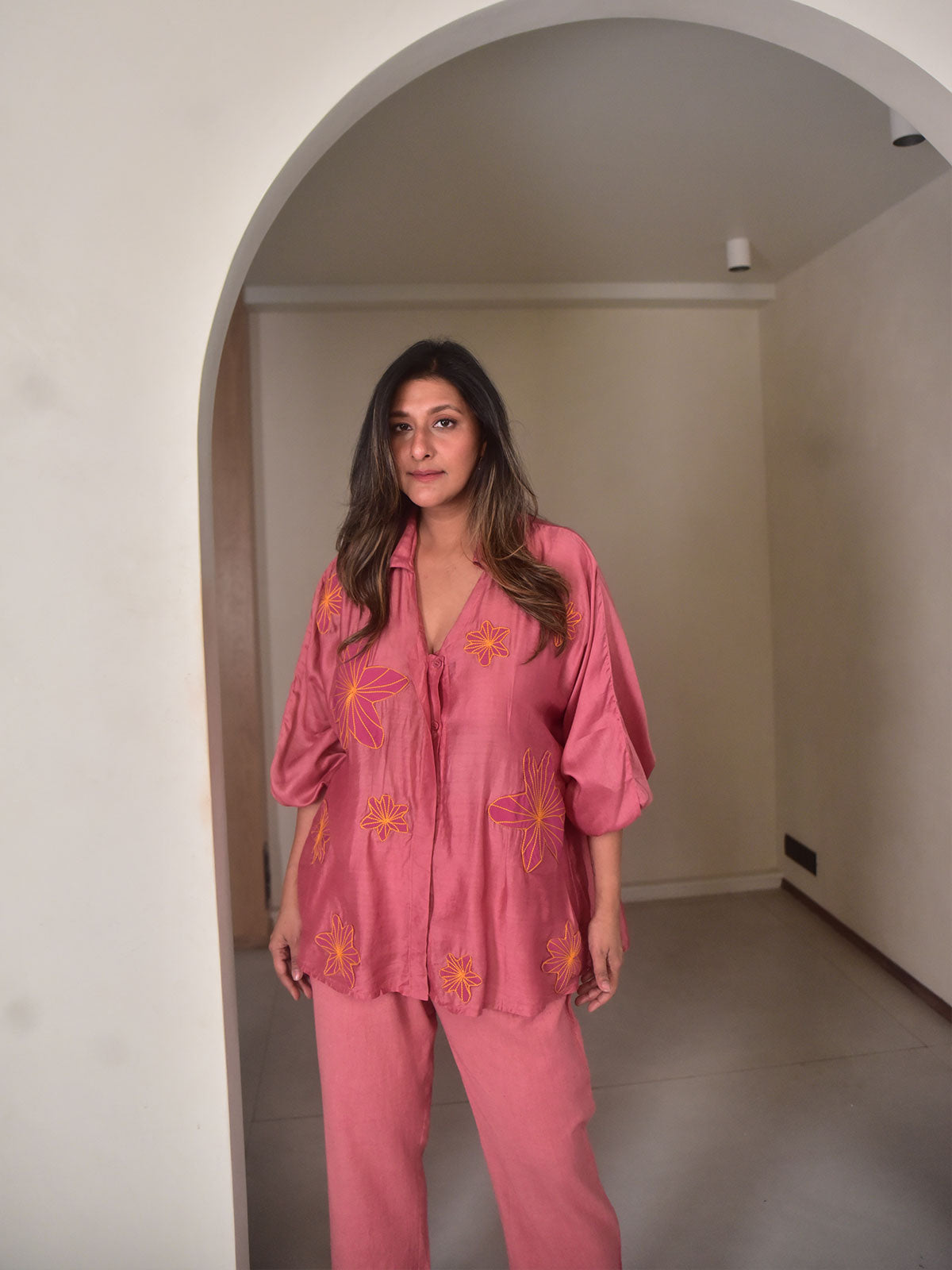 A soft statement in modern simplicity, this set is a delicate fusion of clean lines and artisanal detailing. The oversized rosewood shirt, cut in fluid modal, features full-length sleeves with gently elasticated cuffs, a classic collar, and a flattering V-neckline. Rosewood flower appliqués are thoughtfully attached, adding a subtle pop of color and texture. A breathable mul cotton slip is layered underneath for comfort, while narrow cotton-linen pants in a matching tone complete the look with sharp tailoring and side pockets.