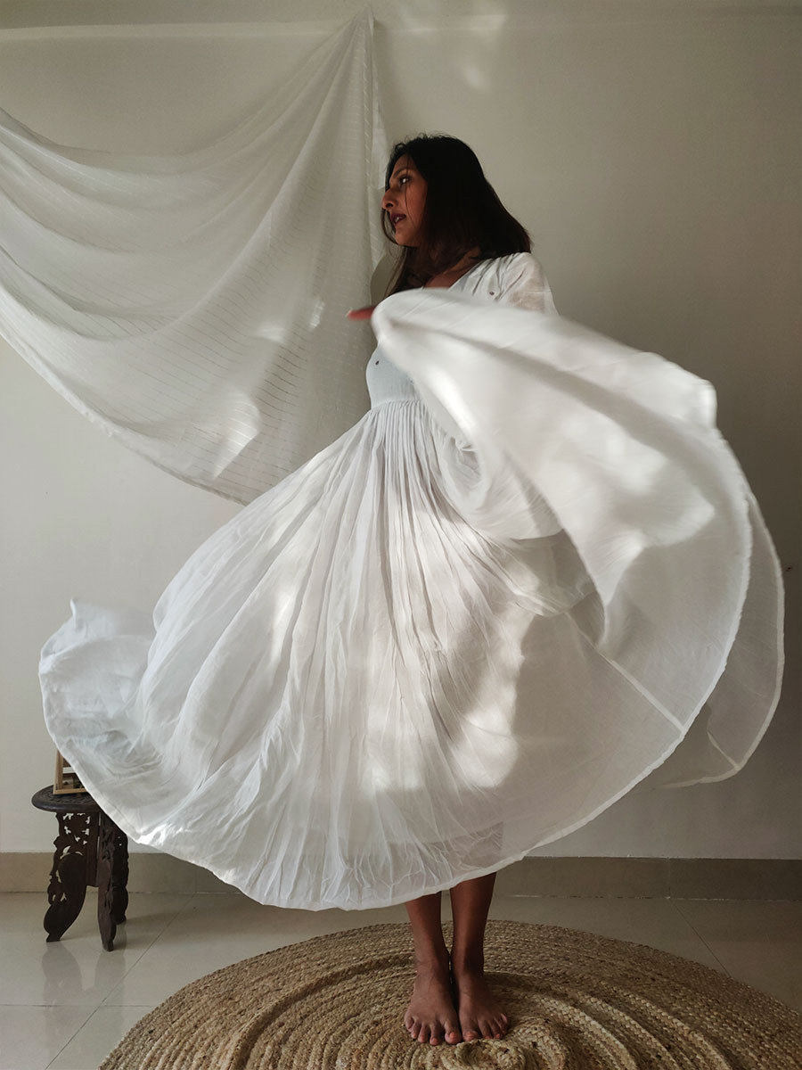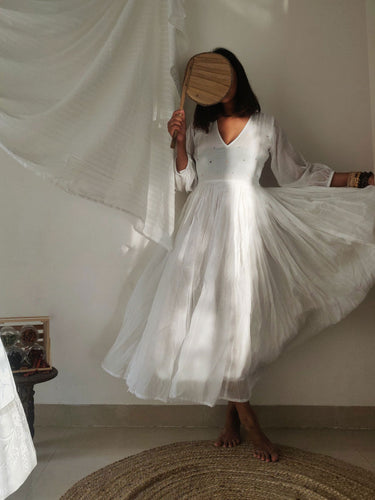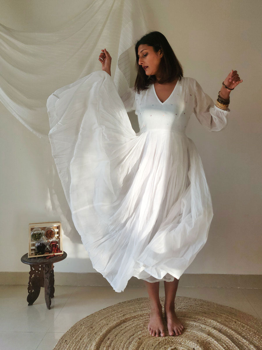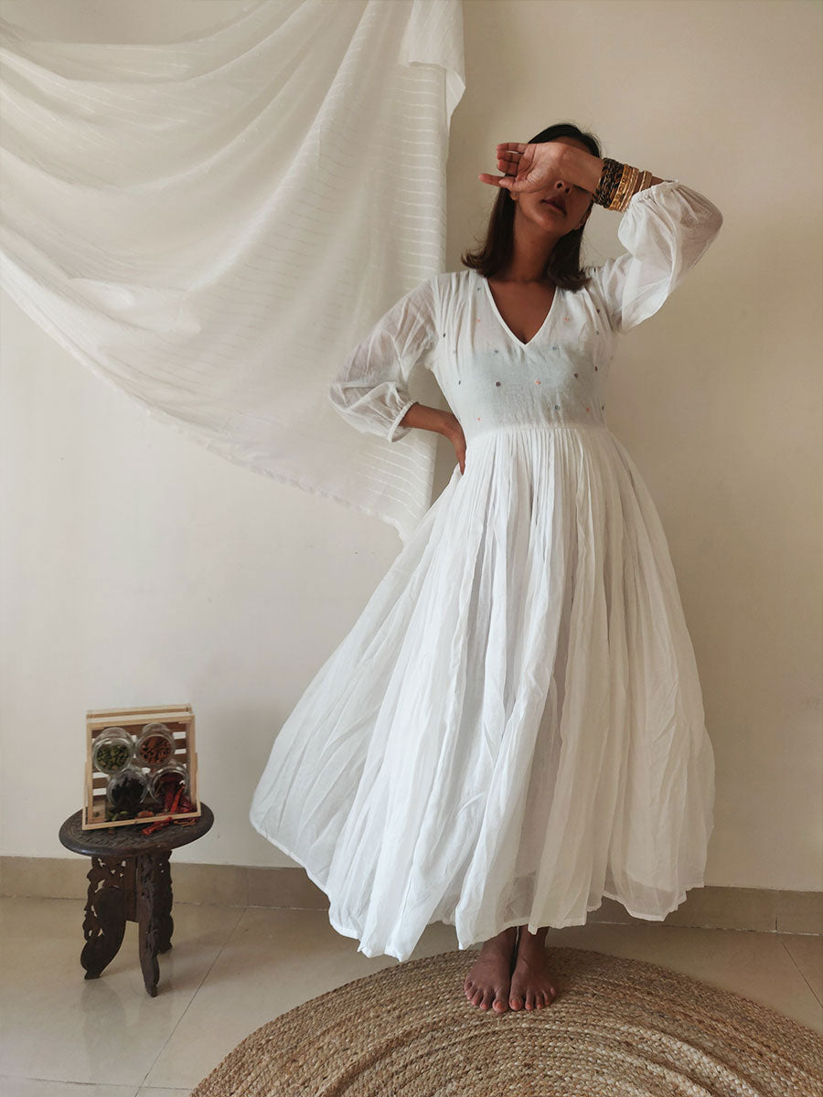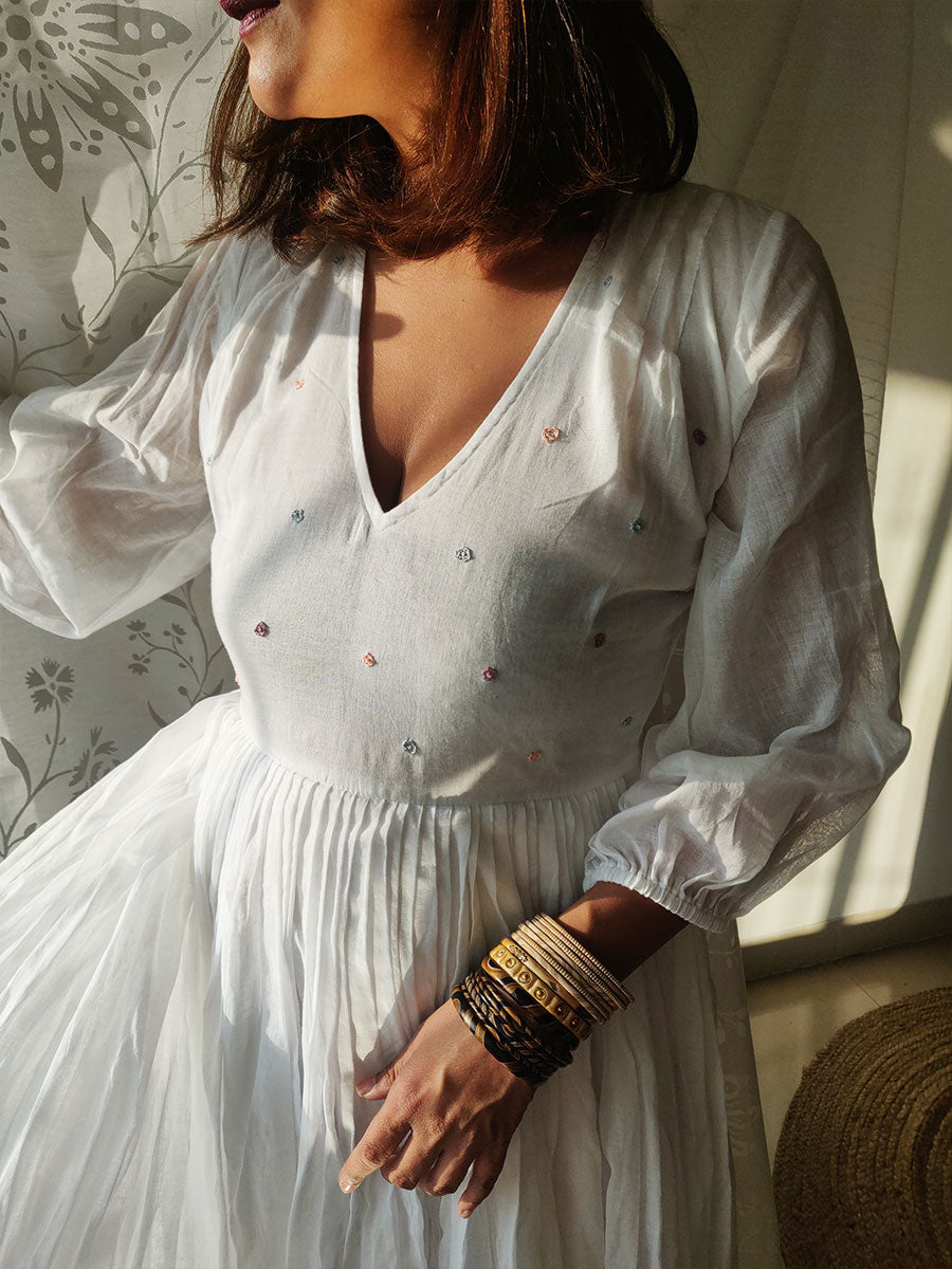 Dreamy, flowy mul fabric that floats around you with every step, this dress will make you yearn for breezy vacays! It has a deep V-neckline and comfy fit bodice, with three-fourth puffed sleeves ending in an elastic cinch. The skirt is fully pleated and billowy with two layers of mul. Delicate pleats detailing at the shoulders and hand-embroidered flowers on the bodice add a pastel touch to this piece.