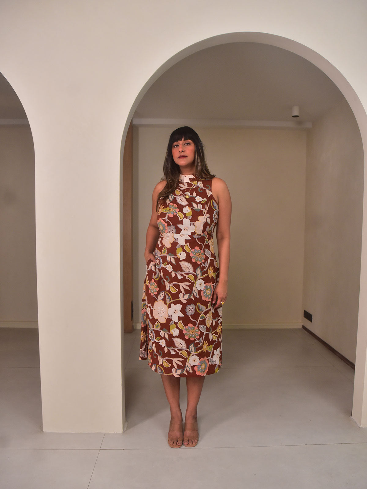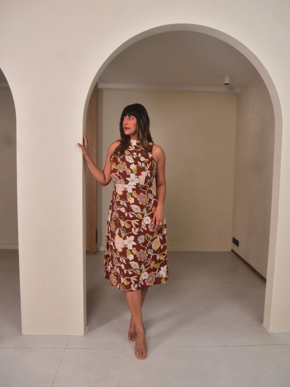 For days that call for simple, timeless style. Cut in our exclusive Brown Floral printed cotton. This fitted dress has an in-cut pattern and short collar. This versatile dress can be worn with stiletto heels and a baguette clutch for a seamless look.