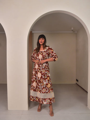 Crafted in our exclusive brown floral printed cotton, this long panel dress blends structure with softness for everyday elegance. Featuring a deep square neckline at the front and back, puff sleeves with smocked cuffs, and functional side pockets, it’s finished with a delicate 4” ecru net border at the hem for a sheer, airy touch. Ideal for summer brunches, art gallery visits, or relaxed evening gatherings. Style it with minimal sandals and statement earrings for a refined yet effortless look.