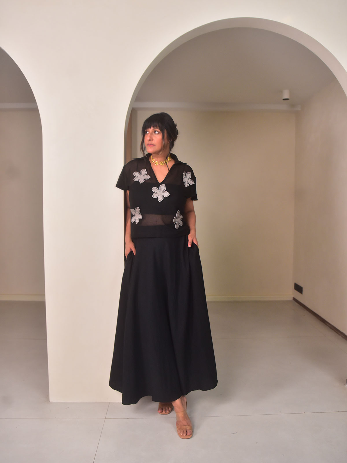 This elegant set features a cropped black cotton net top with handcrafted floral appliqués, classic collars, and back tie-ups for adjustable shaping, paired with a flowing black cotton linen umbrella skirt. The skirt’s elasticated waist ensures comfort while offering beautiful movement and flare. Ideal for festive evenings, celebrations, or special occasions. Style with minimal heels and statement accessories for a striking yet effortless ensemble.