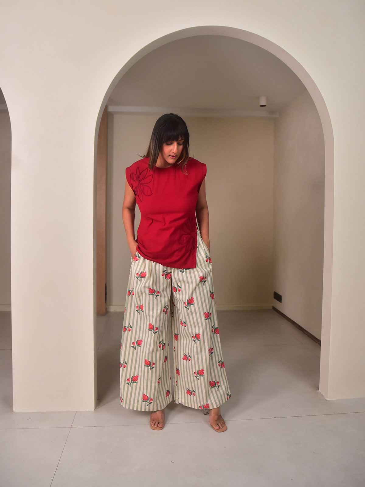 The Anar Pants feature a high-waisted, wide-leg silhouette in our exclusive green stripes printed cotton, detailed with soft front pleats and side pockets for effortless comfort. Designed with a front zipper-button closure and elasticated back, they’re perfect for summer brunches or casual workdays. Style them with our Rena Top and sandals for an easy, polished look.