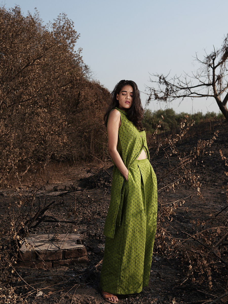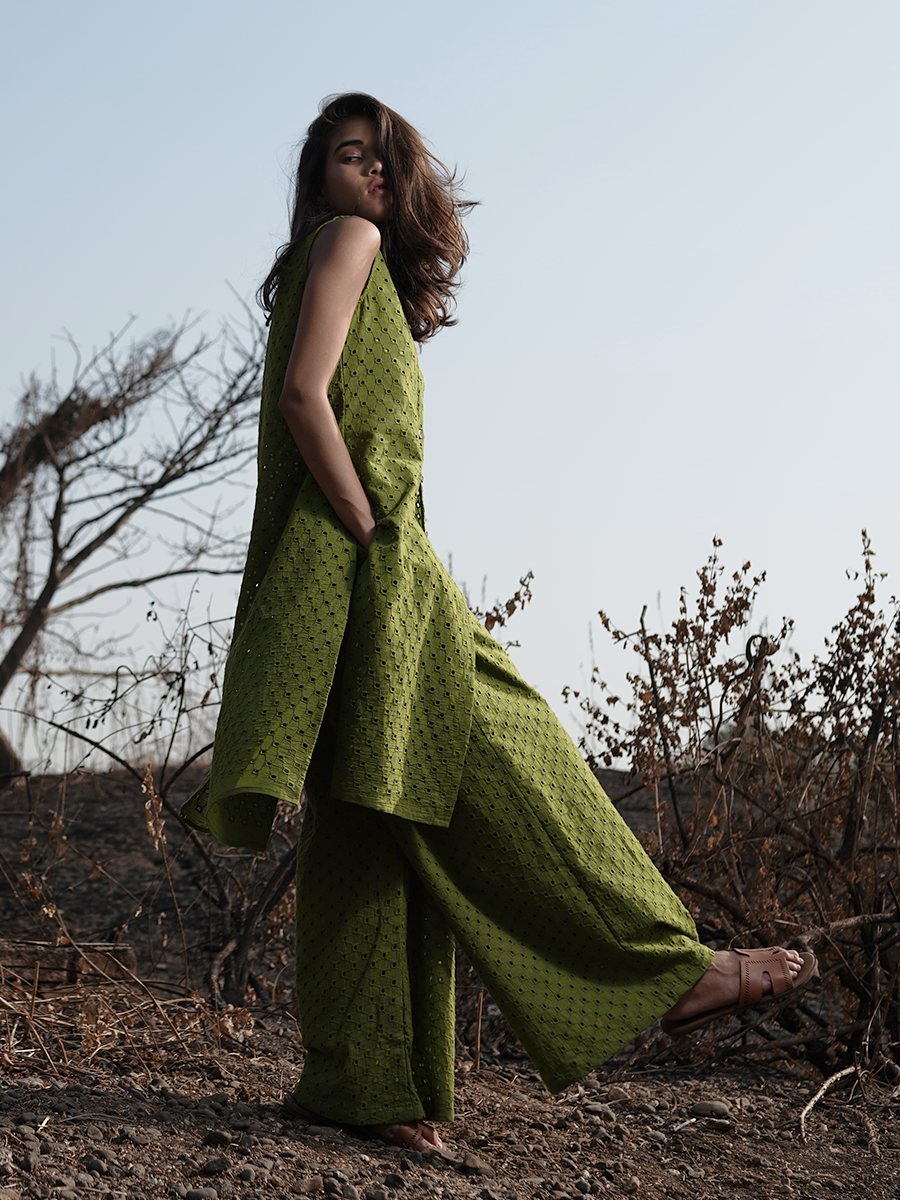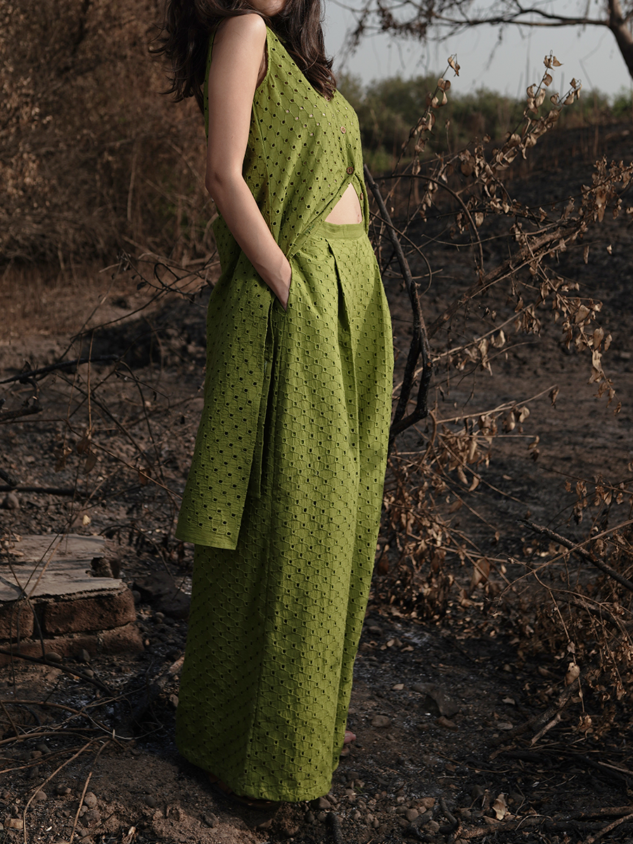 Cut in moss green embroidered cut-work cotton, these pleated-style loose pants are downright comfy for a good hot summer! It is lined with a cotton fabric and can be worn with a kurta as much as a cropped top!Â