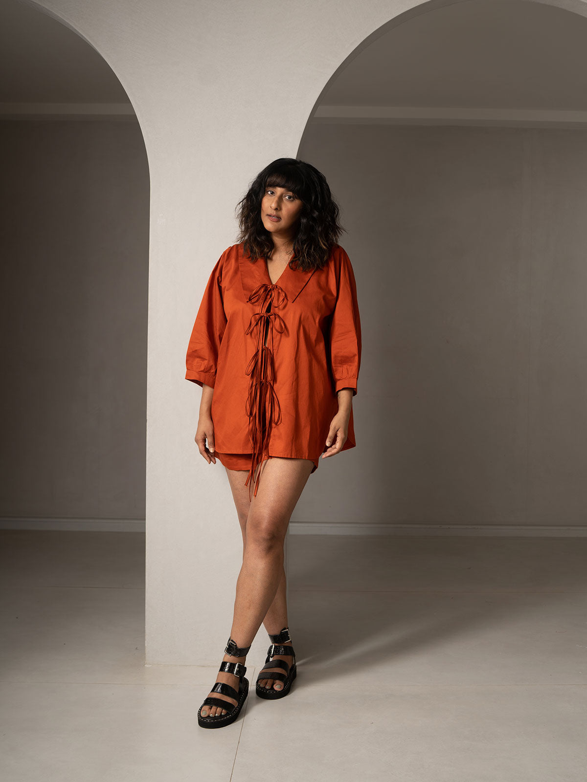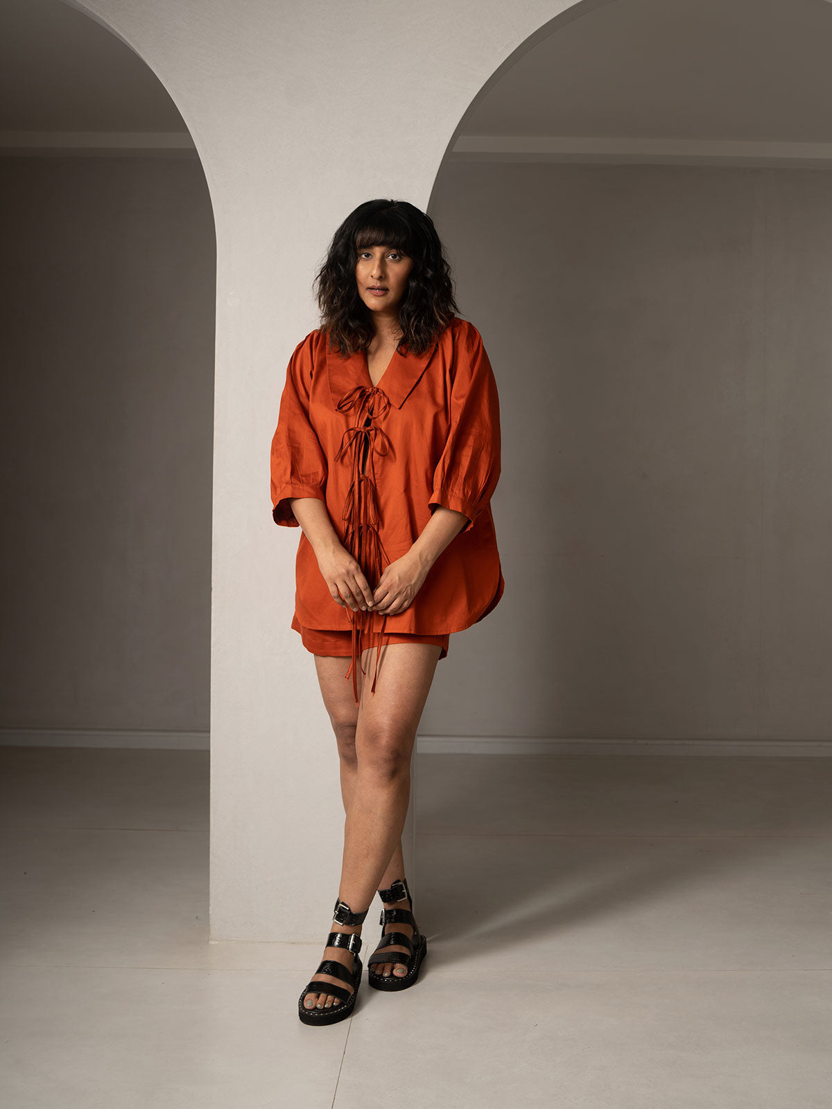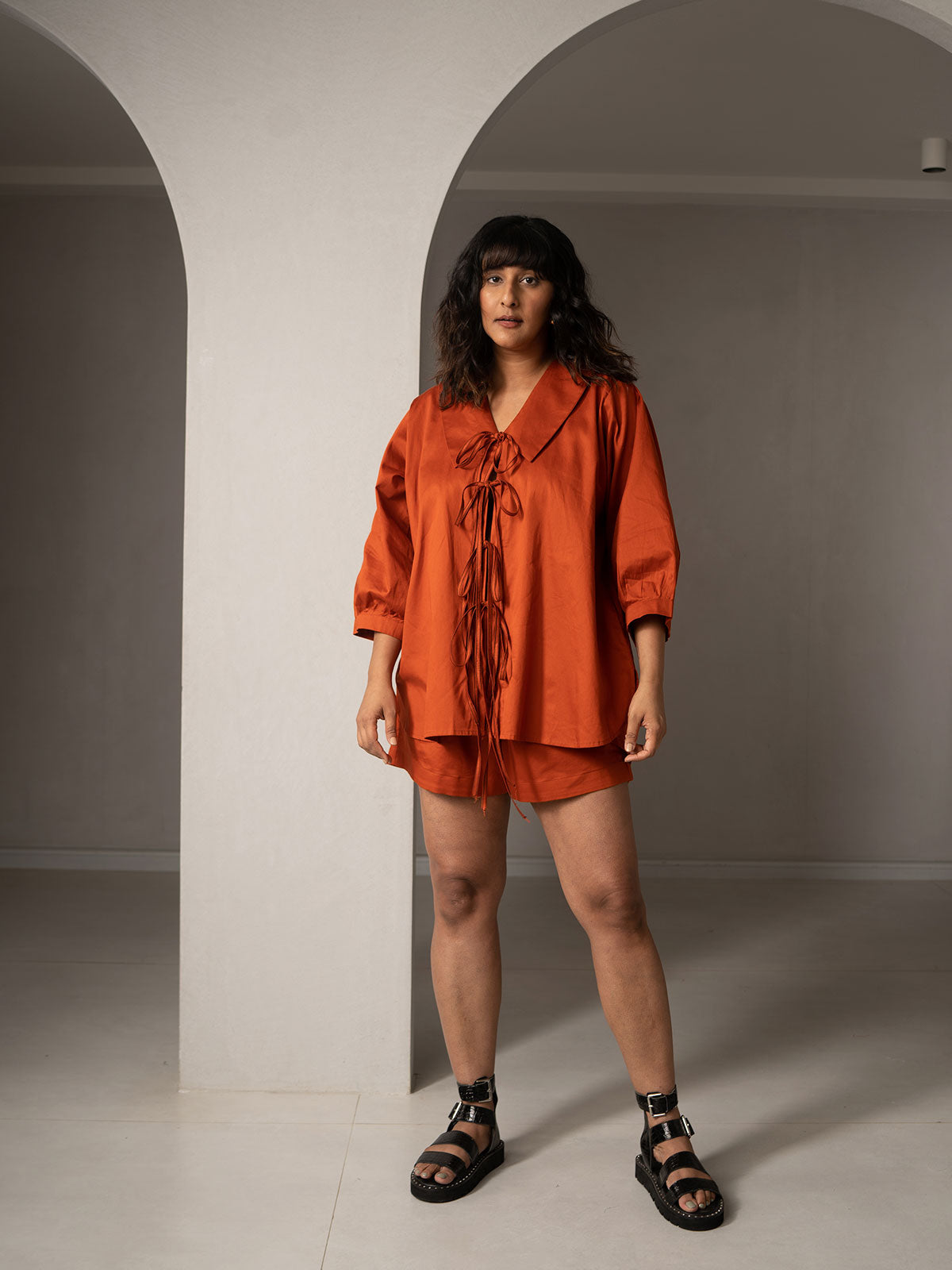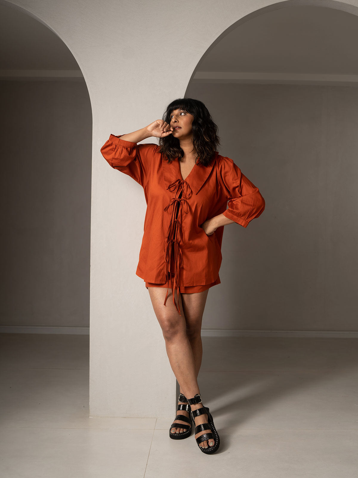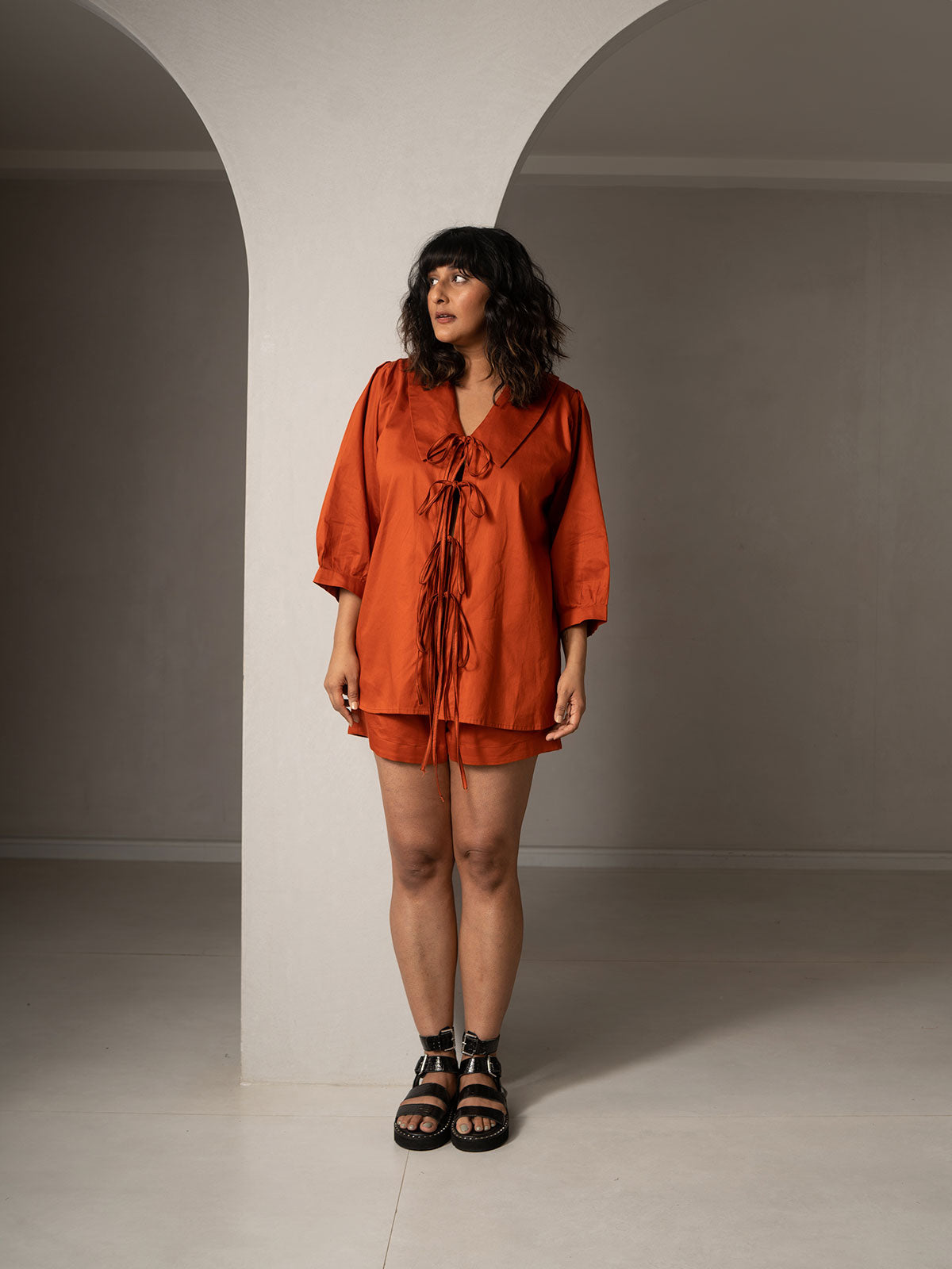 A laid-back luxury. This effortlessly chic co-ords set is designed to brighten up your week! It features standout collars, loose pleated puff sleeves, and adorable tie-ups at the front.