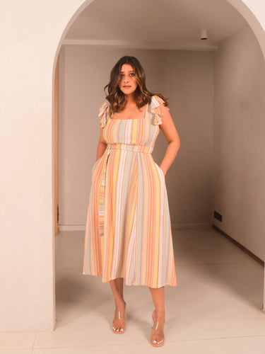 This fit-and-flare dress in printed rayon cotton features a wide square neckline, sleeveless cut with shoulder ruffles, and three flared vertical panels. A detachable belt adds definition, while side pockets and a back zipper ensure comfort. Pair with block heels and delicate jewelry for a fresh, easy work look. Great for summer office days, creative showcases, or work brunches.