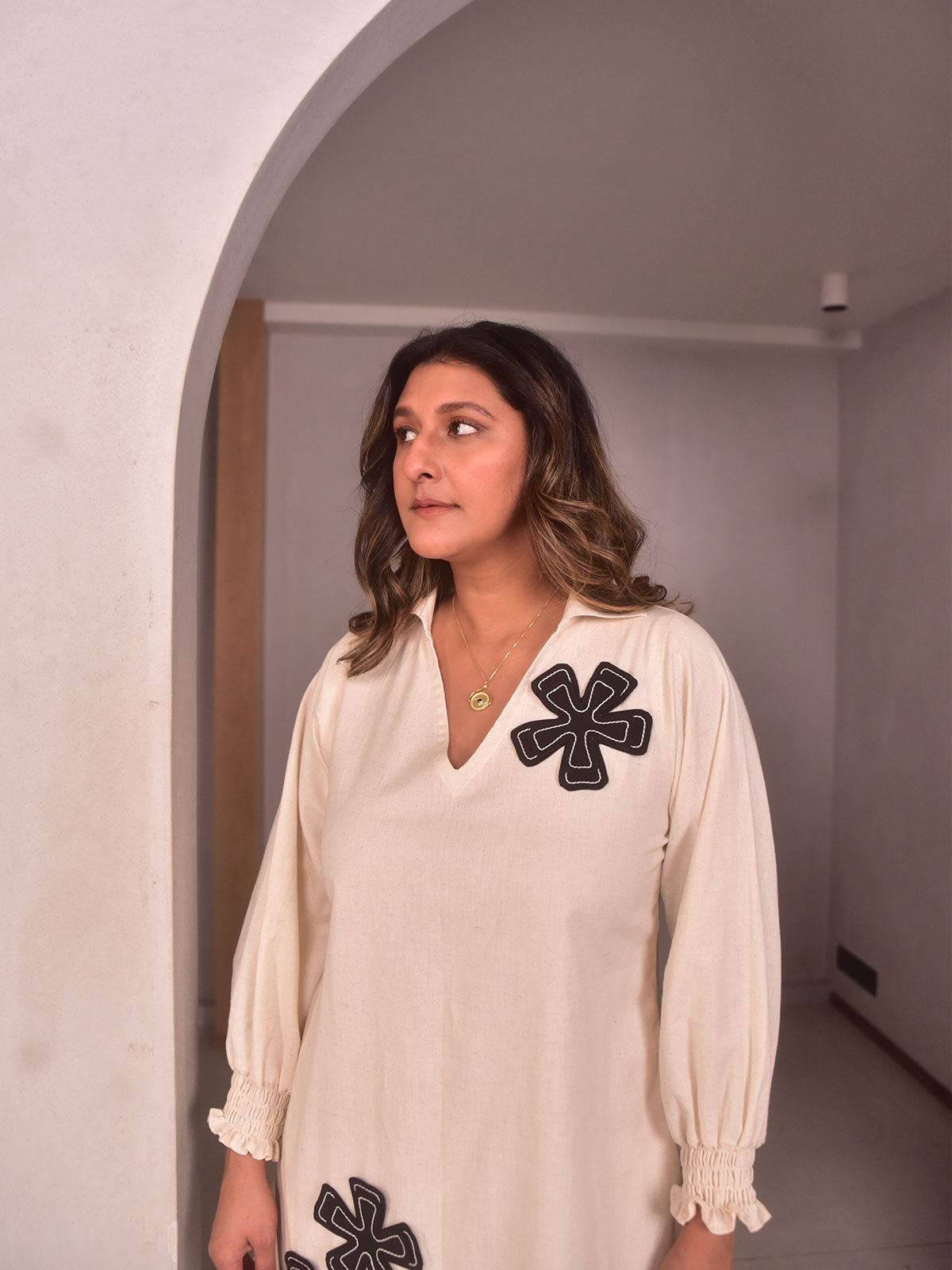 Cut in soft cotton linen, this A-line short dress features a V-neckline with collar, full sleeves with smocked cuffs, and delicate double floral appliqués. Perfect for city sightseeing or brunch on vacation, it blends comfort with artistry. Style it with tan flats and a woven tote for a relaxed, elegant look.