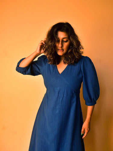 Chic meets comfort. Cut in deep ink blue cotton, this dress has a V-neck and long puffed sleeves. The flared skirt has pockets on both sides. Versatile silhouette with endless styling options for your everyday wardrobe.