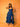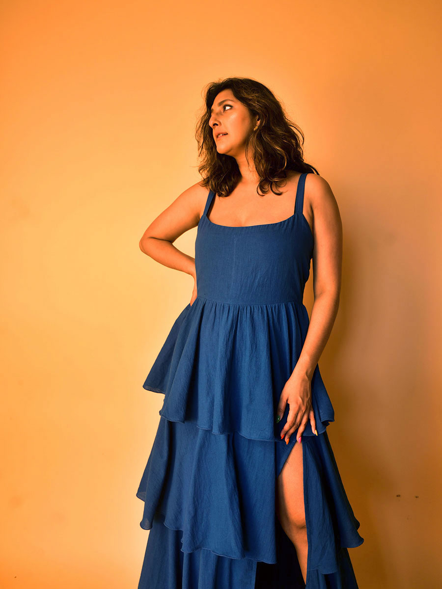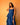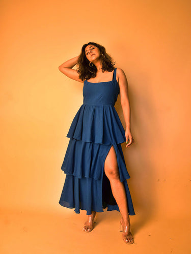 Richly textures and smoking silhouette come together in this deep ink blue cotton dress. Fitted bodice and wide neck with straps. Ruffled skirt for a gorgeous twirl, complete with a smoking thigh-high slit. Pair with golds and heels for a glamorous red-carpet look.
