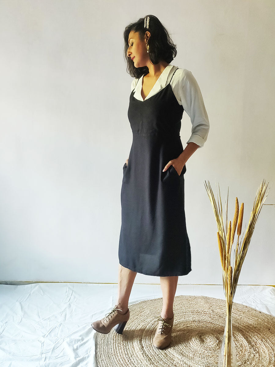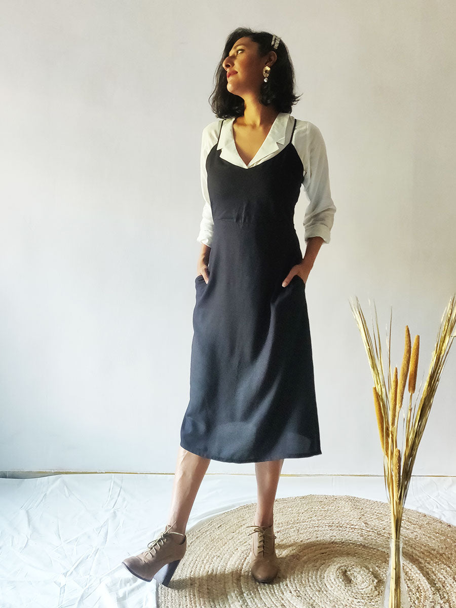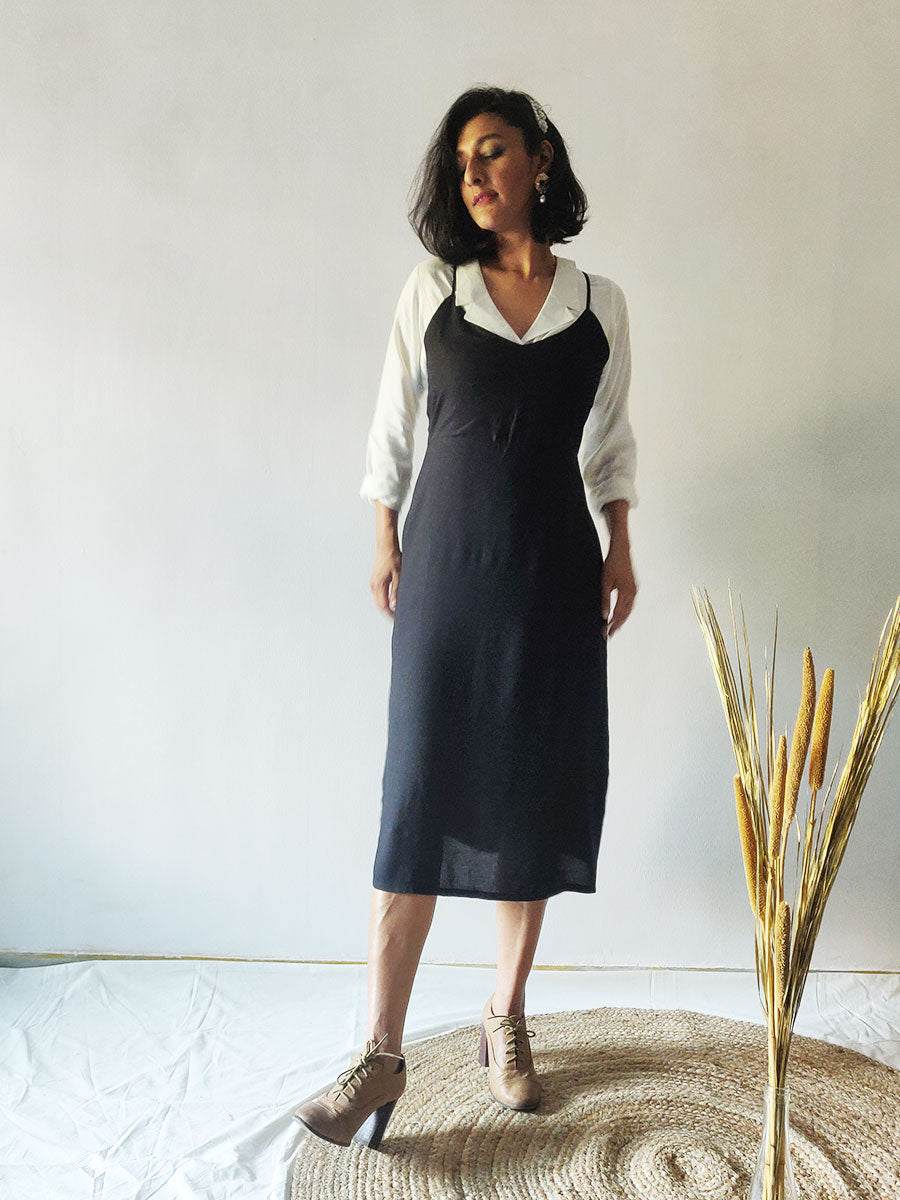 This stunner is going to dominate your party wardrobe! Cut in soft black rayon cotton, this flowy dress has a fitted bodice with spaghetti straps and a cross-back pattern! The skirt has slits! From classic studs to dramatic neckpieces, this dress can be styled in any way imaginable! We’ve paired it with our Pearl Shirt, transforming it into a classy workwear outfit that is sure to turn heads!