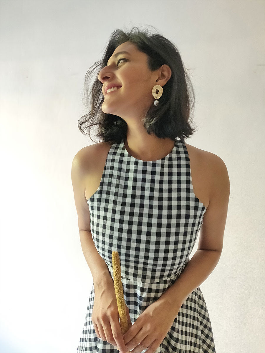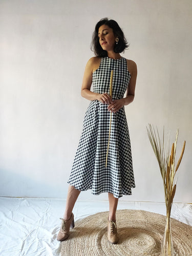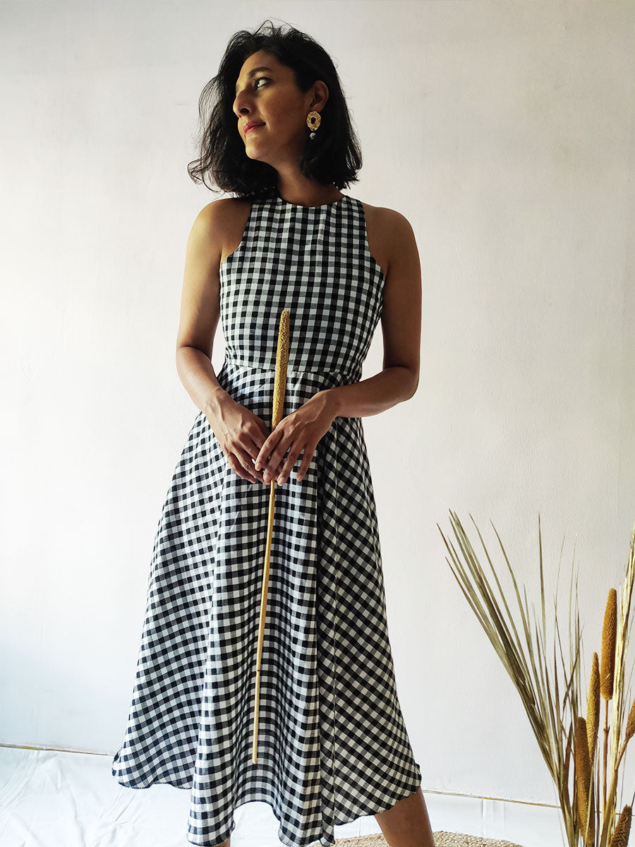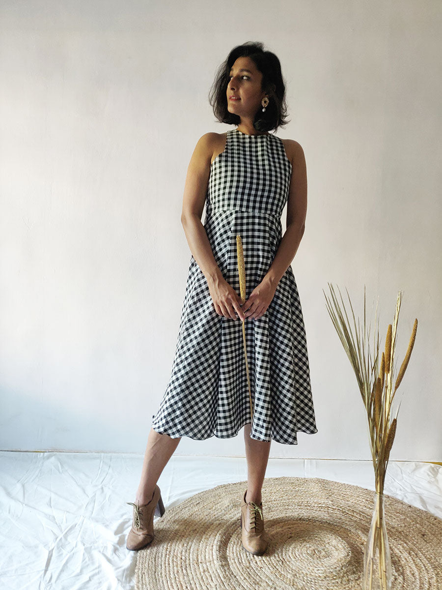 Umbrella-cut dresses have never looked more better! This black and white dress is cut in a lovely checkered cotton, with a fitted bodice and full-flared skirt. The bodice has a quirky in-cut pattern. This dress highlights your shoulders and hugs all the right curves! Pair with pumps and a bright bag for a lovely day out!
