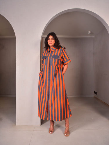 Desk to dinner, in comfort and style. Cut in our exclusive Orange and Grey striped hand-screen printed cotton, this loose-fit silhouette has cute and classic collars and short sleeves. Pockets on the sides and chest pockets highlighted with hand-embroidery. This dress comes with a belt for added style and versatility.