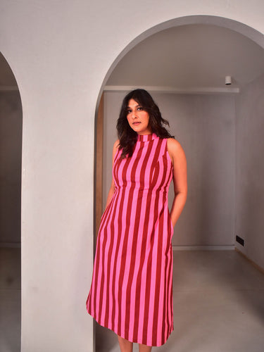For days that call for simple, timeless style. Cut in our exclusive Pink and Maroon striped hand-screen printed cotton. This fitted dress has an in-cut pattern and short collar.
