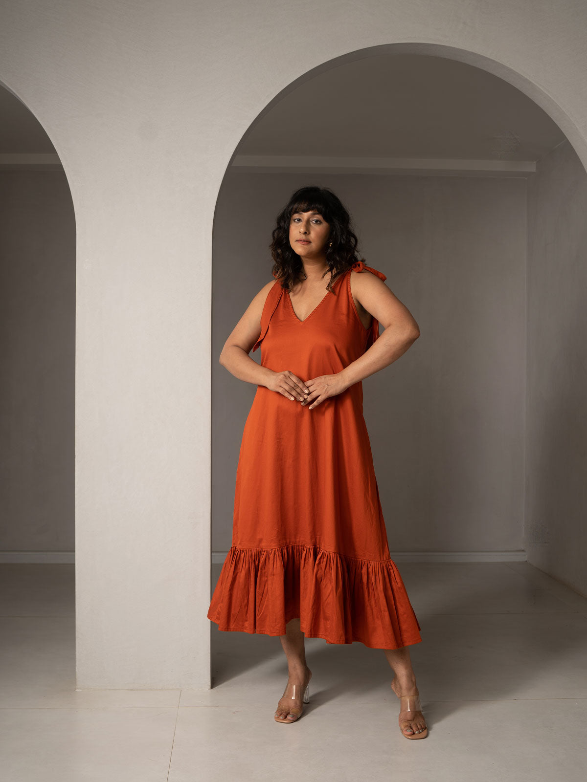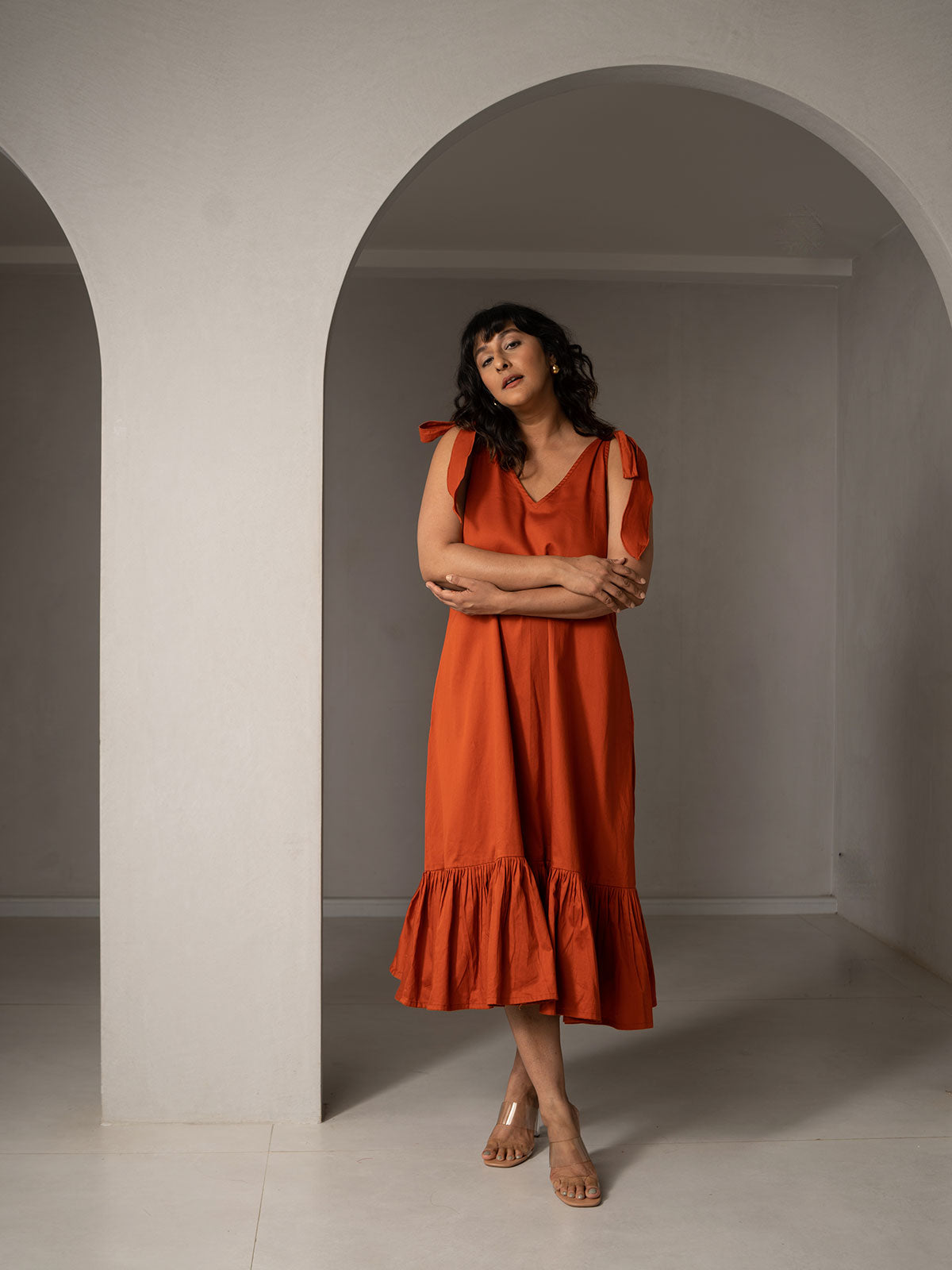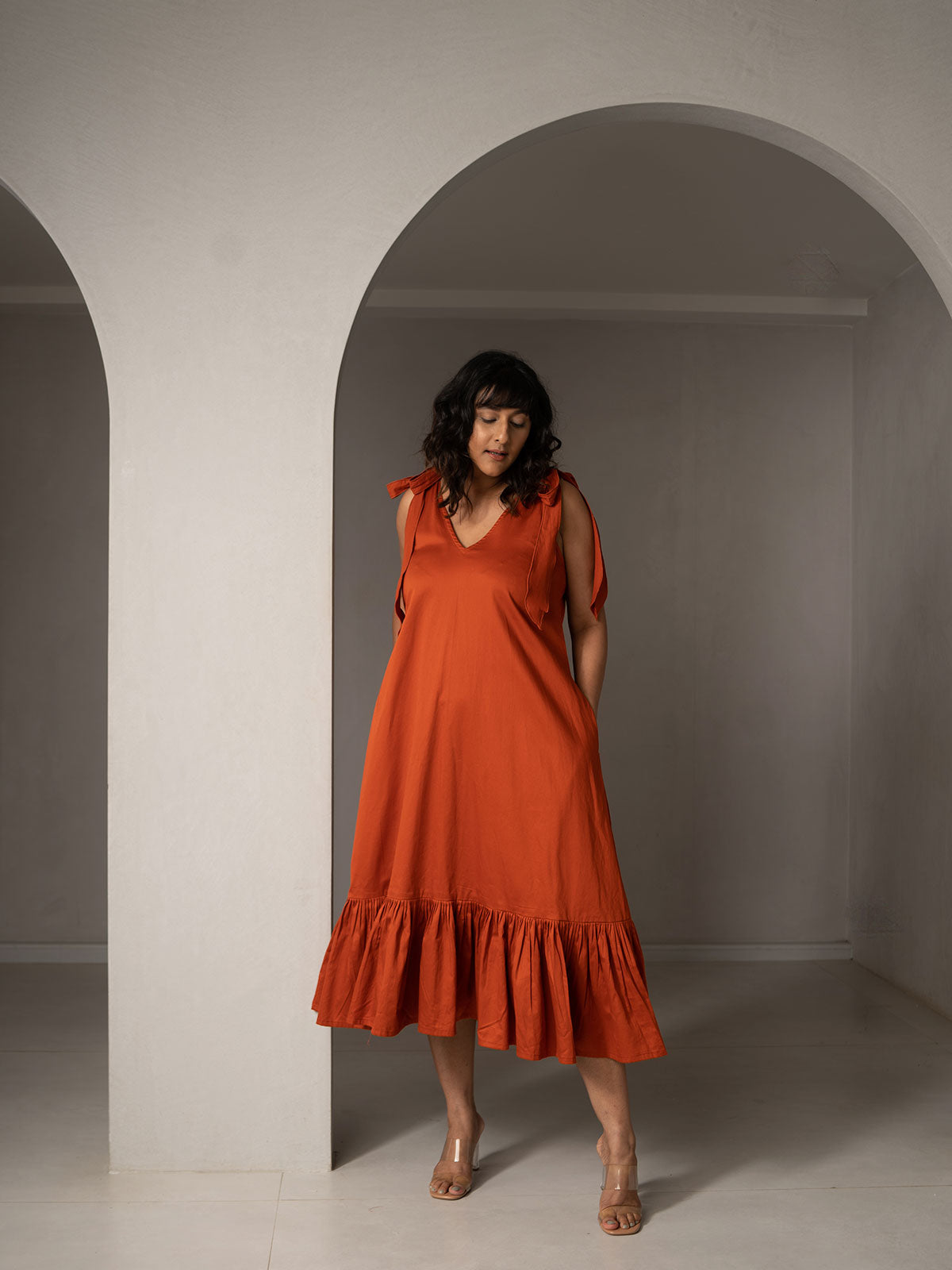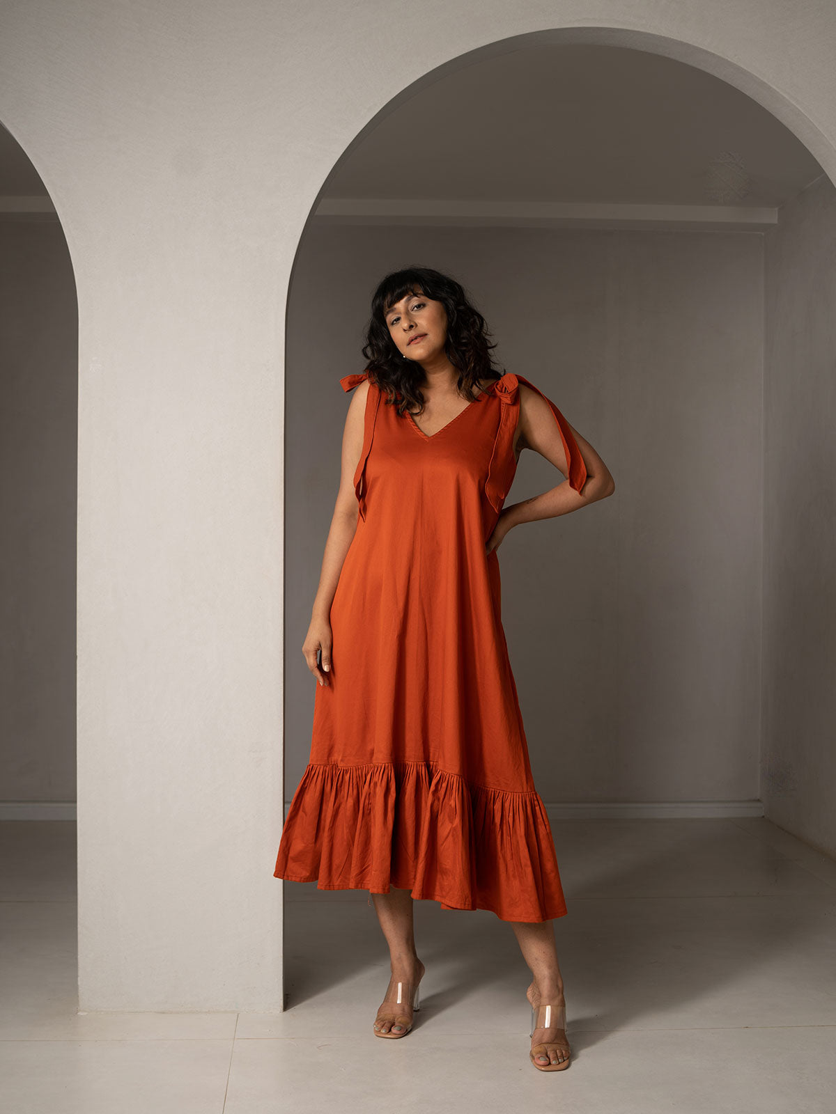 Easy breezy summer ready. Made in Broken Twill fabric, with a simple V-neck and flared silhouette. The shoulder tie-up at the shoulder adds a cute,and ruffles at the hemline add to the swish when you turn!