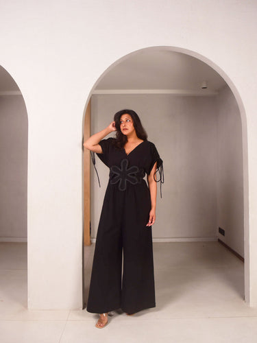 Designed for movement, made for everyday ease. This elevated look is cut in black cotton linen. Subtle adjustable ruching on the shoulders and sleeves and a fitted waist with flared pants. Detailed, hand-sewn 3D appliqué flowers add depth and elegance to the look. Pair with strappy heels or block sandals to elongate your legs and balance the structure of the jumpsuit.