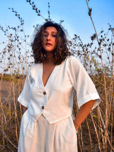 This shirt-meets-blouse is a touch of elegance for your staples. Cut in eggshell white cotton, it has flared sleeves and loose bodice. An overlapping placket in the front complete with wooden buttons. Pair with our Lana Pants for the full look.