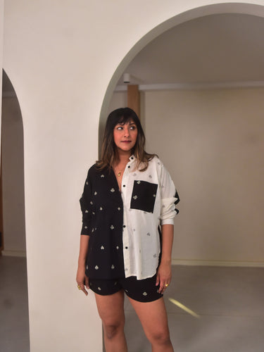 This relaxed shirt is cut in our exclusive white and black playing cards printed cotton, designed with a striking half-and-half concept. One side features the white print while the other is rendered in black, finished with a contrast patch pocket and an apple-cut hem for ease. Perfect for casual outings, vacations, or creative workdays. Style it with our black playing cards printed shorts or wear it open over a tank for a laid-back look.
