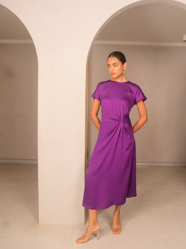 A modern classic with a touch of flair, this sleeveless dress is cut from rich purple modal satin that catches the light with a luxurious sheen. Featuring a round neckline, concealed back zipper, and relaxed drop shoulders, the knotted detailing at the front adds a sculptural element to the minimalist design. Perfect for cocktail evenings or intimate festive dinners.