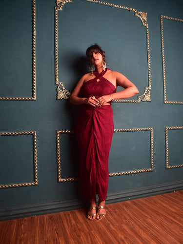 From the screen to the red carpet, this look is one to turn heads. Cut in our exclusive rich maroon modal jacquard fabric, with a woven pattern and elevated sheen skirt with a knot detail in the front. This Co-ord Set comes with Irina Top.