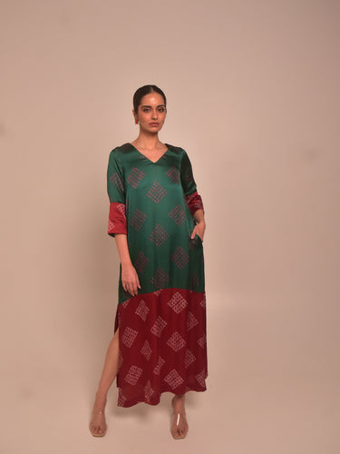 A harmonious blend of festive tones, this relaxed A-line dress is cut in our green kolam printed modal satin with rich maroon patch panels at the hem and sleeves. Featuring a flattering V neckline, side slits, and practical pockets, it brings comfort and charm together. Perfect for daytime celebrations or cultural events, pair it with oxidized jewelry and slip-on sandals for an effortless look.