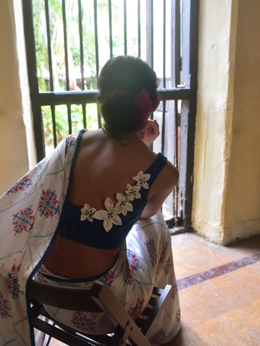 Crafted from cobalt blue modal satin, this sleeveless blouse is designed with floral appliqués and intricate bead embroidery on the front and back neckline. Padded for comfort and finished with a hook-eye closure, it adds a festive statement to any saree. Pair it with our cream kolam printed saree for a sophisticated and bold contrast, and style with chandbalis and a sleek bun.