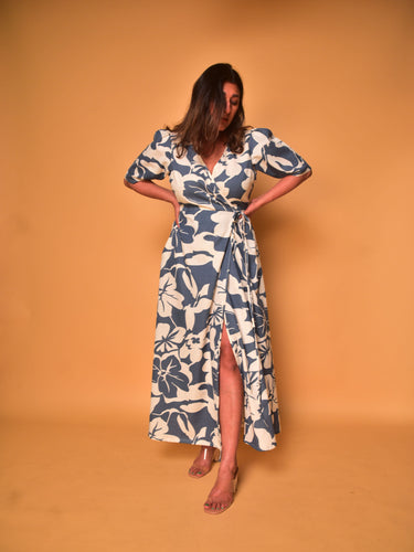 Our bestselling silhouette is back in this stunning summer print! Cut in blue floral printed cotton, this wrap dress is designed with a flattering deep V neckline and short sleeves. The flared skirt wraps around with ties on either side for a lovely cinch. Pair with some pumps to style it up, and a clutch for an elegant look.