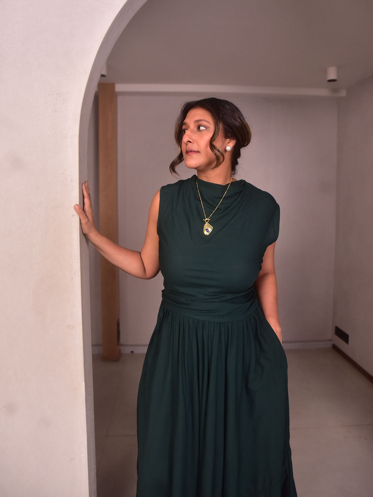 This deep green rayon co-ord is equal parts comfort and charm. The sculpted cowl-neck top features shoulder pleats, side ruching, and a back zipper. Paired with a pleated umbrella skirt featuring side pockets and elastic at waist, this set offers structure with movement. Wear with heeled sandals and gold accessories ideal for evening strolls, weekend getaways or dinner parties.