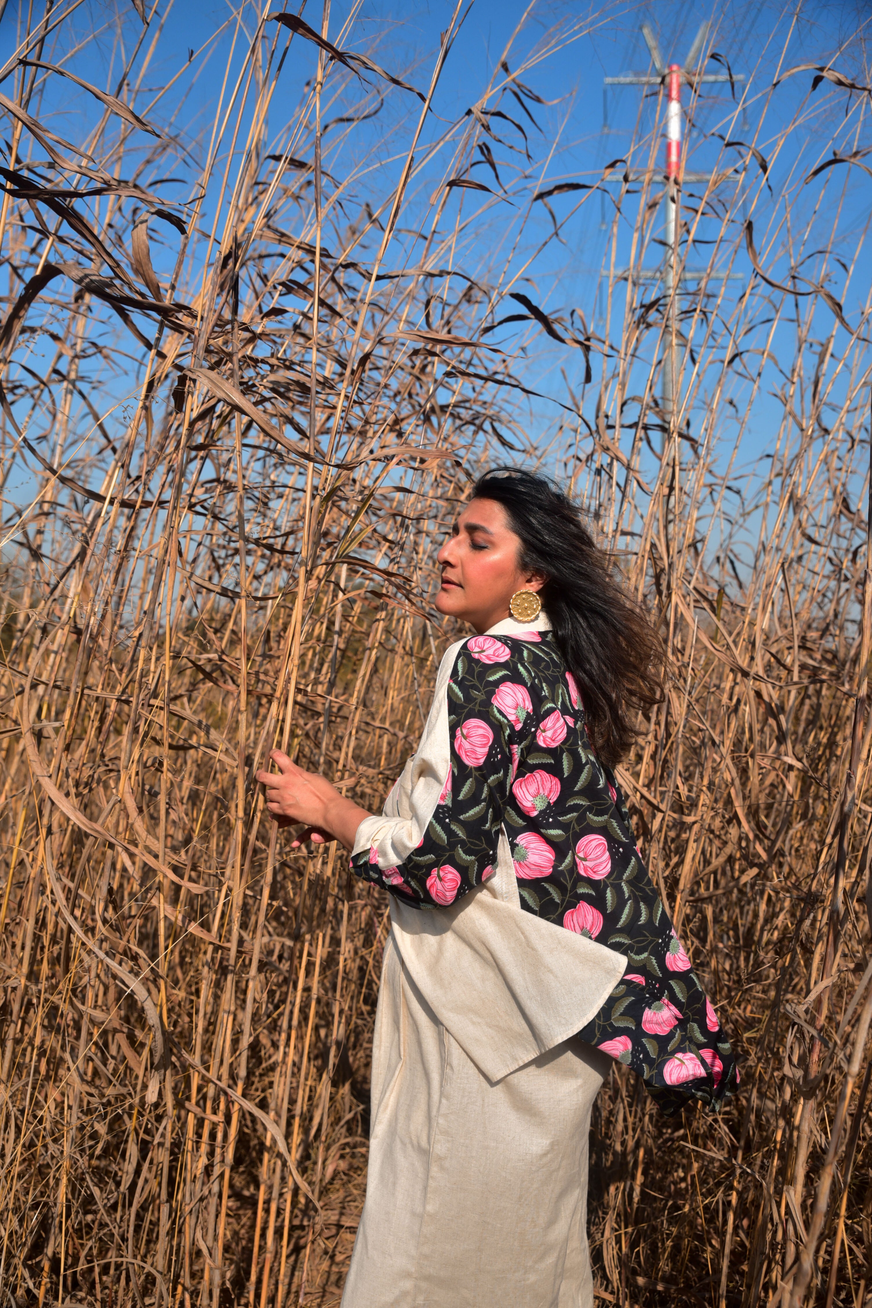 This oversized shirt is here to make a statement! With the front half cut in cream linen cotton, the back is cut in a fun floral print. Pockets with print detailing for the final touch. Pair with our Amara Linen Shorts or Amara Linen Pants for the full lounge look.