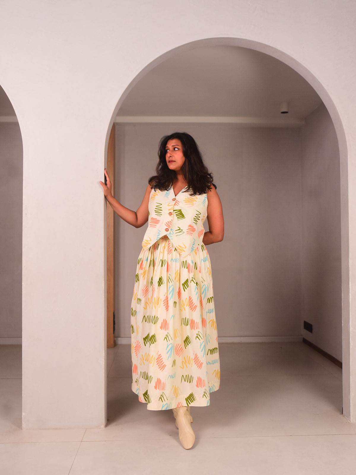 This fun pleated skirt is cut in our exclusive cream and colourful scribble hand-screen printed cotton, adding movement and texture to your outfit. Complete with pockets, this skirt adds levity to any occasion. Pair with our Poppy Vest for the co-ordinated look.
