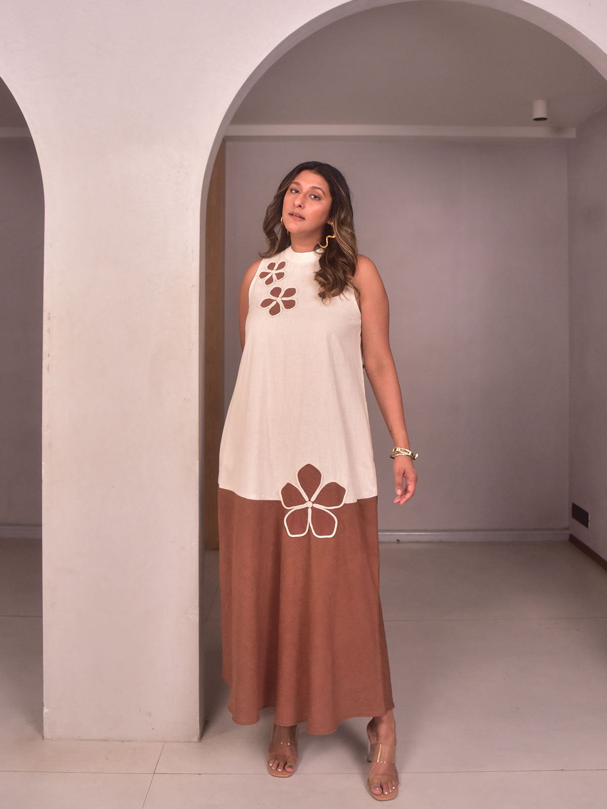Crafted from cotton linen, this long dress features a closed neck, side pockets, and a contrast hem panel adorned with floral appliqués outlined in cord piping. It’s perfect for evening strolls or intimate dinners on vacation. Pair it with block heels and statement earrings for an elevated, graceful look.
