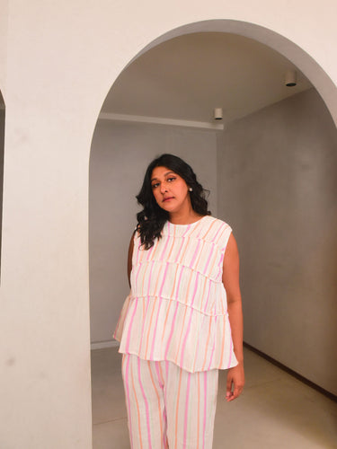 Cut in airy striped cotton gauze, this sleeveless top features soft horizontal gather panels and a round neckline for an easy, feminine silhouette. Ideal for warm days, its pastel tones soothe while the design adds a playful charm. Pair it with denims or linen trousers for an everyday look that feels thoughtful yet effortless.