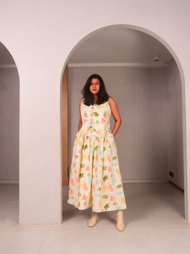 Cut in our exclusive cream and colourful scribble hand-screen printed cotton. Our Poppy Vest features buttons at the front and a clean silhouette. Pair with our Poppy Skirt for the co-ordinated look.