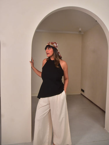 This black dyed cotton linen halter top mirrors a sculpted, contemporary silhouette with a cinched waist and asymmetric hem. Finished with side zipper with hook-and-eye closure, it offers both structure and ease. Ideal for evening gatherings, celebrations, or elevated casual wear. Pair it with Amara pants and sleek heels for a timeless look.