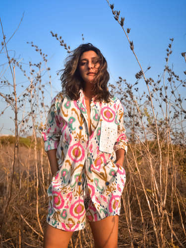 Cut in white and multicoloured printed cotton, this oversized shirt has a contrast cut-work embroidered cotton pocket. Pair with our Simone Shorts for the complete lounge look. And if you want to mix it up, this shirt is versatile for styling - from your favourite denims to cutoffs, trousers or cotton shorts, each look is a different vibe!