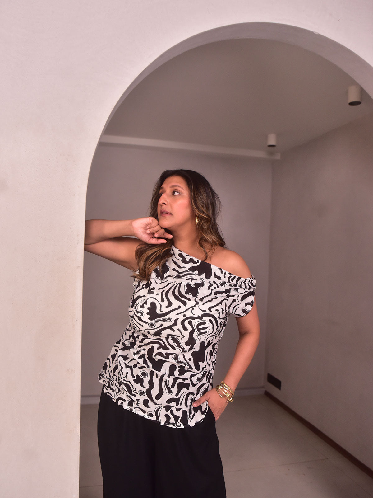This asymmetric top in hand-screen-printed black and white modal cotton features pleats on the shoulder and side to beautifully contour the waist. Perfect for evening outings or stylish vacations, it blends statement design with comfort. Pair it with black flared pants and bold earrings for a chic, modern look.