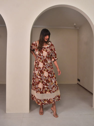 Crafted in our exclusive brown floral printed cotton, this long panel dress blends structure with softness for everyday elegance. Featuring a deep square neckline at the front and back, puff sleeves with smocked cuffs, and functional side pockets, it’s finished with a delicate 4” ecru net border at the hem for a sheer, airy touch. Ideal for summer brunches, art gallery visits, or relaxed evening gatherings. Style it with minimal sandals and statement earrings for a refined yet effortless look.