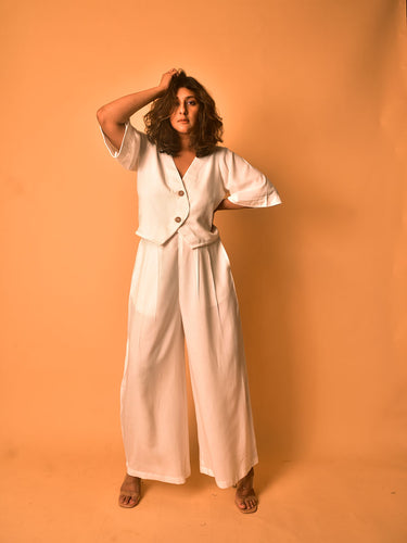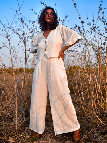 A fresh new all-white look to elevate your staples. Cut in eggshell white cotton, the shirt has flared sleeves and loose bodice. An overlapping placket in the front complete with wooden buttons. The pants have a pleats in the front, with elastic at the back for elegance and comfort. Accessorize with gold for a timeless look.