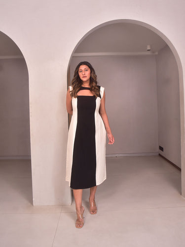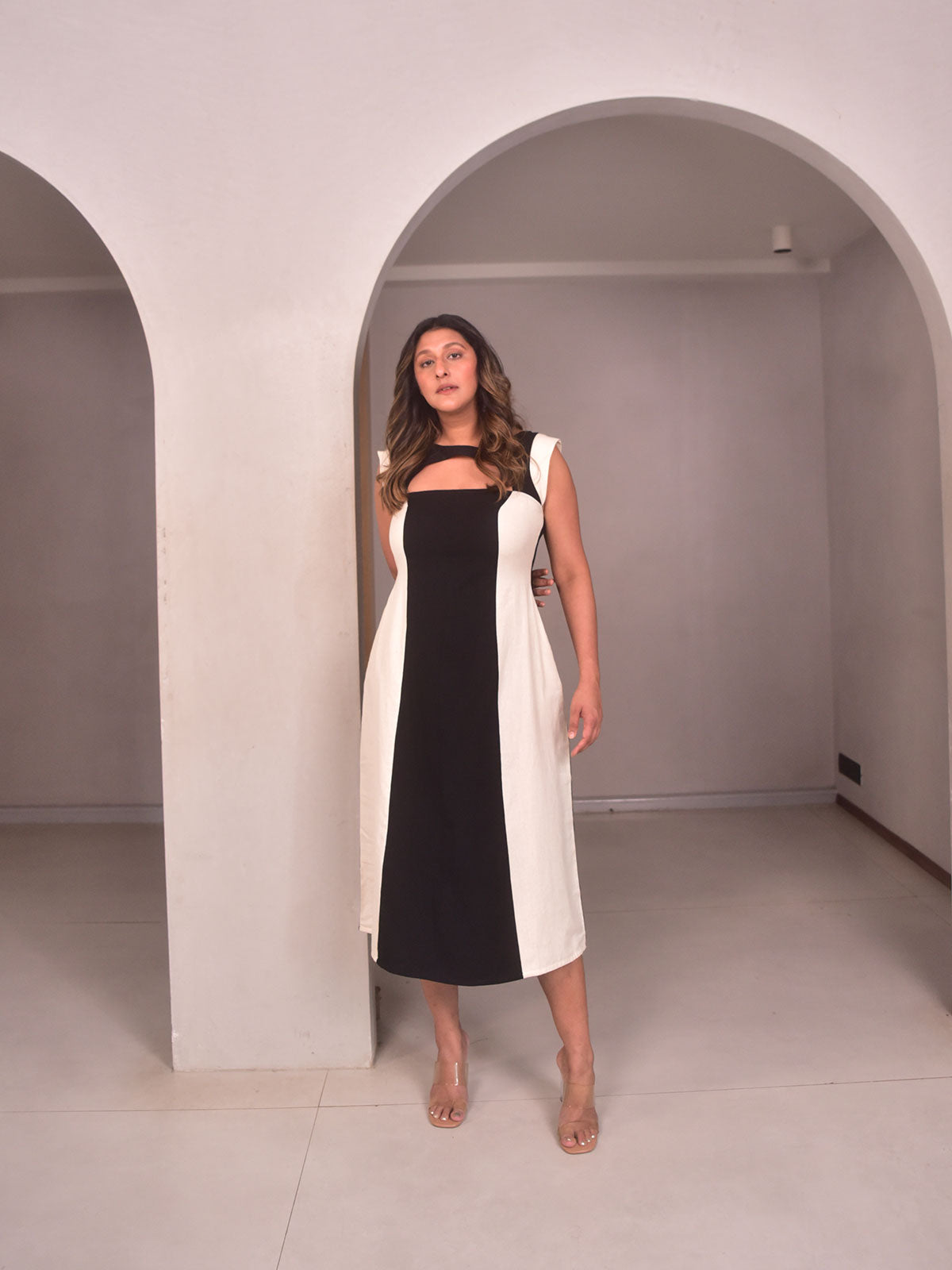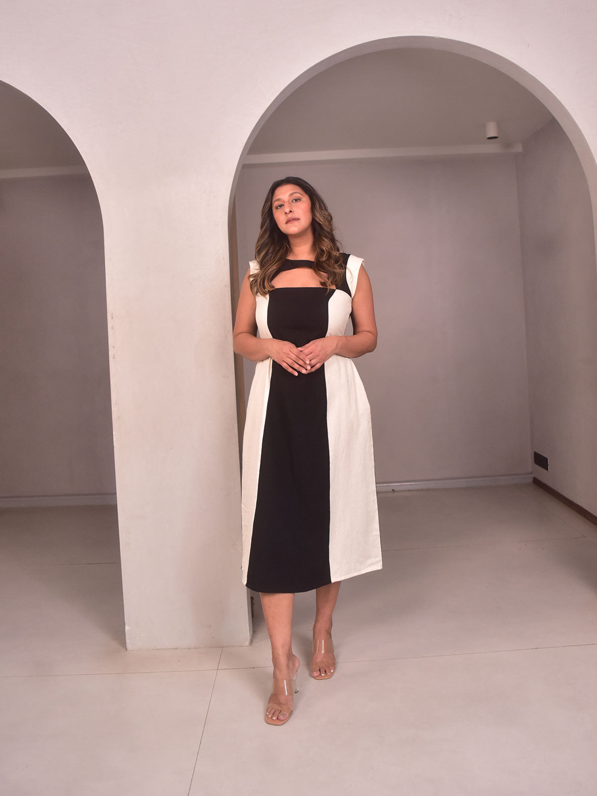 Cut in black and beige cotton linen, this dress features a front cutout, boat neckline, and structured mega sleeves for a flattering silhouette. It’s perfect for evening outings or contemporary brunch looks. Style it with block heels and minimal accessories for modern elegance.